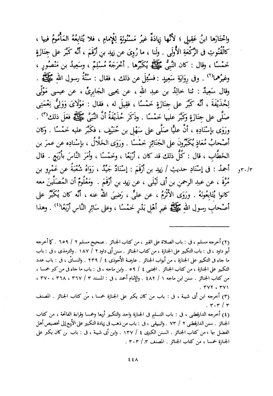 واخْتَارَها ابنُ عَقِيلٍ؛ لأنَّها زِيادَةٌ غيرُ مَسْنُونَةٍ لِلْإِمامِ، فلا يُتَابِعُهُ المَأْمُومُ فيها، كالْقُنُوتِ في الرَّكْعَةِ الأُولَى. ولَنا، ما رُوِىَ عن زيدِ بنِ أَرْقَمَ، أنَّه كَبَّرَ على جِنَازَةٍ خَمْسًا، وقال: كان النَّبِىُّ -صلى اللَّه عليه وسلم- يُكَبِّرُها. أخْرَجَهُ مُسْلِمٌ، وسَعِيدُ بن مَنْصُورٍ، وغيرُهما (٢). وفي رِوَايَةِ سَعِيدٍ: فسُئِلَ عن ذلك، فقال: سُنَّةُ رسولِ اللهِ -صلى اللَّه عليه وسلم-. وقال سَعِيدٌ: ثنا خالِدُ بن عبدِ اللهِ، عن يحيى الجَابِرِيِّ، عن عيسى مَوْلًى لِحُذَيْفَةَ، أنَّه كَبَّرَ على جِنَازَةٍ خَمْسًا، فقِيلَ له، فقال: مَوْلَاىَ وَوَلِىُّ نِعْمَتِى صَلَّى على جِنَازَةٍ وكَبَّرَ عليها خَمْسًا. وذَكَرَ حُذَيْفَةُ أنَّ النَّبِىَّ -صلى اللَّه عليه وسلم- فعَلَ ذلك (٣). ورَوَى بإسْنَادِهِ، أنَّ عليًّا صَلَّى على سَهْلِ بن حُنَيْفٍ، فَكَبَّرَ عليه خَمْسًا. وكان أصْحابُ مُعَاذٍ يُكَبِّرُونَ على الجَنَائِزِ خَمْسًا. ورَوَى الخَلَّالُ، بإسْنادِه عن عمرَ بن الخَطَّابِ، قال: كُلُّ ذلك قد كان، أرْبَعًا، وخَمْسًا، وأمَرَ النَّاسَ بأرْبَعٍ. قال أحمدُ: في إسْنَادِ حديثِ زيدِ بن أَرْقَمَ: إسْنَادٌ جَيِّدٌ، رَوَاهُ شُعْبَةُ عن عَمْرِو بن مُرَّةَ، عن عبدِ الرحمنِ بن أبي لَيْلَى، عن زيدِ بنِ أرْقَمَ. ومَعْلُومٌ أن المُصَلِّينَ معه كانوا يُتَابِعُونَهُ. ورَوَى الأثْرَمُ، عن عليٍّ، رَضِىَ اللهُ عنه، أنَّه كان يُكَبَّرُ على أصْحابِ رسولِ اللهِ -صلى اللَّه عليه وسلم- غيرِ أهْلِ بَدْرٍ خَمْسًا، وعلى سَائِرِ النَّاسِ أرْبَعًا (٤). وهذا