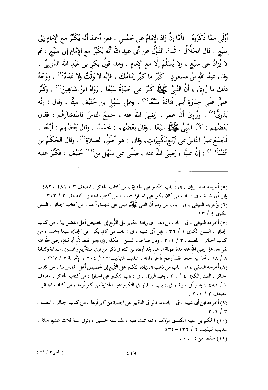 أوْلَى ممَّا ذَكَرُوهُ. فأمَّا إنْ زَادَ الإِمامُ عن خَمْسٍ، فعن أحمدَ أنَّه يُكَبِّرُ مع الإِمامِ إلى سَبْعٍ. قال الخَلَّالُ: ثَبَتَ القَوْلُ عن أبي عبدِ اللهِ أنَّه يُكَبِّرُ مع الإِمامِ إلى سَبْعٍ، ثم لا يُزَادُ على سَبْعٍ، ولا يُسَلِّمُ إلَّا مع الإِمامِ. وهذا قولُ بكرِ بن عَبْدِ اللَّه المُزَنِىِّ. وقال عبدُ اللهِ بنُ مسعودٍ: كَبِّرْ ما كَبَّرَ إمَامُكَ، فإنَّه لا وَقْتٌ ولا عَدَدٌ (٥). ووَجْهُ ذلك ما رُوِىَ، أنَّ النَّبِىَّ -صلى اللَّه عليه وسلم- كَبَّرَ عَلى حَمْزَةَ سَبْعًا. رَوَاهُ ابنُ شَاهِينَ (٦). وكَبَّرَ عَليٌّ علَى جِنَازَةِ أبى قَتادَةَ سَبْعًا (٧)، وعلى سَهْلِ بن حُنَيْف سِتًّا، وقال: إنَّه بَدْرِيٌّ (٨). وَرُوِىَ أنَّ عمرَ، رَضِىَ اللهُ عنه، جَمَعَ الناسَ فاسْتَشَارَهُم، فقال بَعْضُهم: كَبَّرَ النَّبِىُّ -صلى اللَّه عليه وسلم- سَبْعًا. وقال بَعْضُهم: خَمْسًا. وقال بَعْضُهم: أَرْبَعًا. فَجَمَعَ عمرُ النَّاسَ على أرْبَعِ تَكْبِيرَاتٍ، وقال: هو أَطْوَلُ الصلاةِ (٩). وقال الحَكَمُ بن عُتَيْبَةَ (١٠): إنَّ عليًّا، رَضِىَ اللهُ عنه، صَلَّى على سَهْلِ بن (١١) حُنَيْف، فكَبَّرَ عَليه