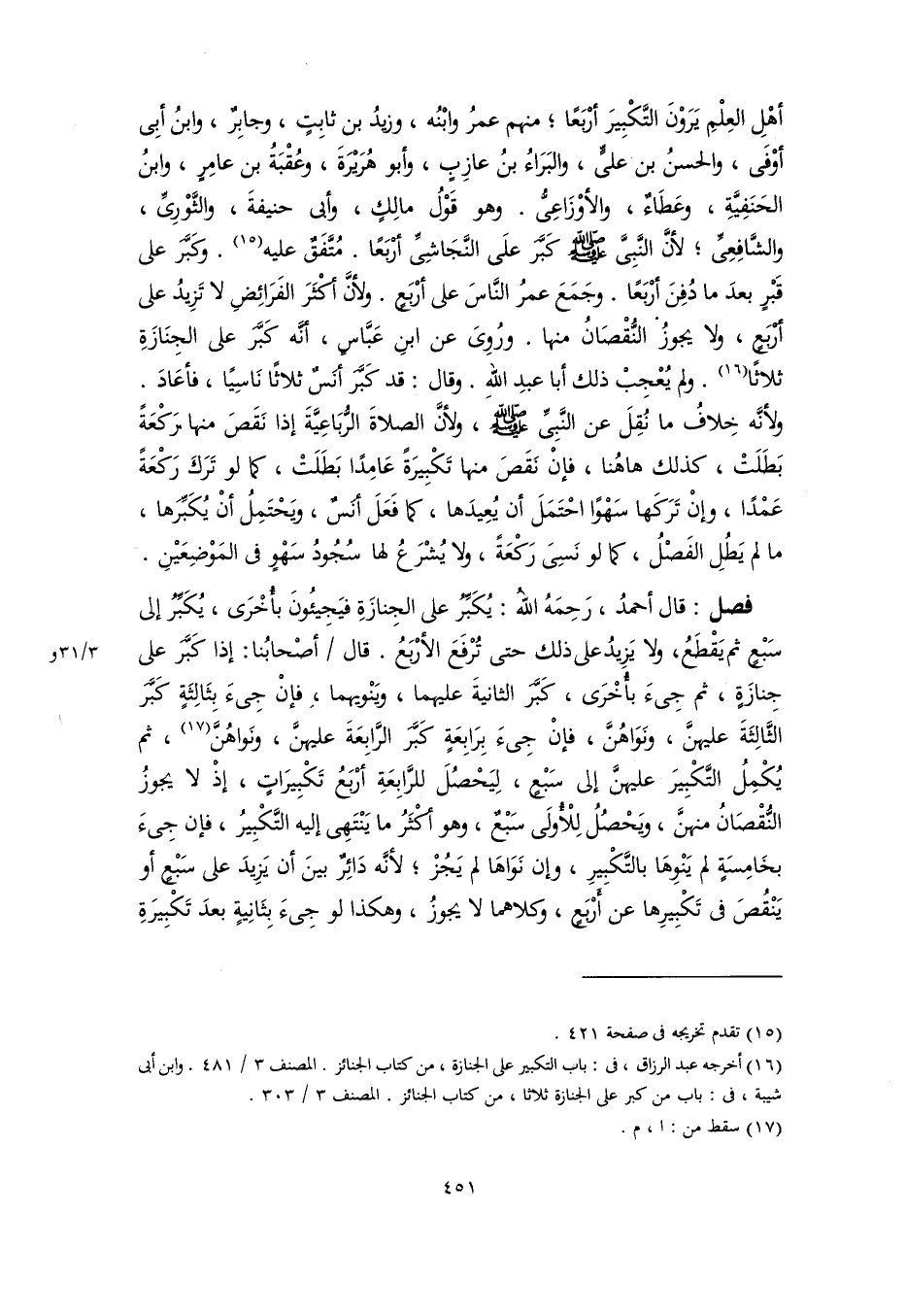 أهْلِ العِلْمِ يَرَوْنَ التَّكْبِيرَ أَرْبَعًا؛ منهم عمرُ وابْنُه، وزيدُ بن ثابِتٍ، وجابِرٌ، وابنُ أبِى أوْفَى، والحسنُ بن عليٍّ، والبَرَاءُ بنُ عازِبٍ، وأبو هُرَيْرَةَ، وعُقْبَةُ بن عامِرٍ، وابنُ الحَنَفِيَّةِ، وعَطَاءٌ، والأوْزَاعِىُّ. وهو قَوْلُ مالِكٍ، وأبي حنيفةَ، والثَّوْرِىِّ، والشَّافِعِىِّ؛ لأنَّ النَّبِىَّ -صلى اللَّه عليه وسلم- كَبَّرَ عَلَى النَّجَاشِىِّ أرْبَعًا. مُتَّفَقٌ عليه (١٥). كَبَّرَ عَلى قَبْرٍ بعدَ ما دُفِنَ أرْبَعًا. وجَمَعَ عمرُ النَّاسَ على أرْبَعٍ. ولأنَّ أَكْثَرَ الفَرَائِضِ لا تَزِيدُ على أرْبَعٍ، ولا يجوزُ النُّقْصَانُ منها. ورُوِىَ عن ابنِ عَبَّاسٍ، أنَّه كَبَّرَ عَلى الجِنَازَةِ ثلاثًا (١٦). ولم يُعْجِبْ ذلك أبا عبدِ اللَّه. وقال: قد كَبَّرَ أنَسٌ ثلاثًا نَاسِيًا، فأعَادَ. ولأنَّه خِلافُ ما نُقِلَ عن النَّبِيِّ -صلى اللَّه عليه وسلم-، ولأنَّ الصلاةَ الرُّبَاعِيَّةَ إذا نَقَصَ منها رَكْعَةً بَطَلَتْ، كذلك ها هُنا، فإنْ نَقَصَ منها تَكْبِيرَةً عَامِدًا بَطَلَتْ، كما لو تَرَكَ رَكْعَةً عَمْدًا، وإنْ تَرَكَها سَهْوًا احْتَمَلَ أن يُعِيدَها، كما فَعَلَ أَنَسٌ، ويَحْتَمِلُ أنْ يُكَبِّرَها، ما لم يَطُلِ الفَصْلُ، كما لو نَسِىَ رَكْعَةً، ولا يُشْرَعُ لها سُجُودُ سَهْوٍ في المَوْضِعَيْنِ.