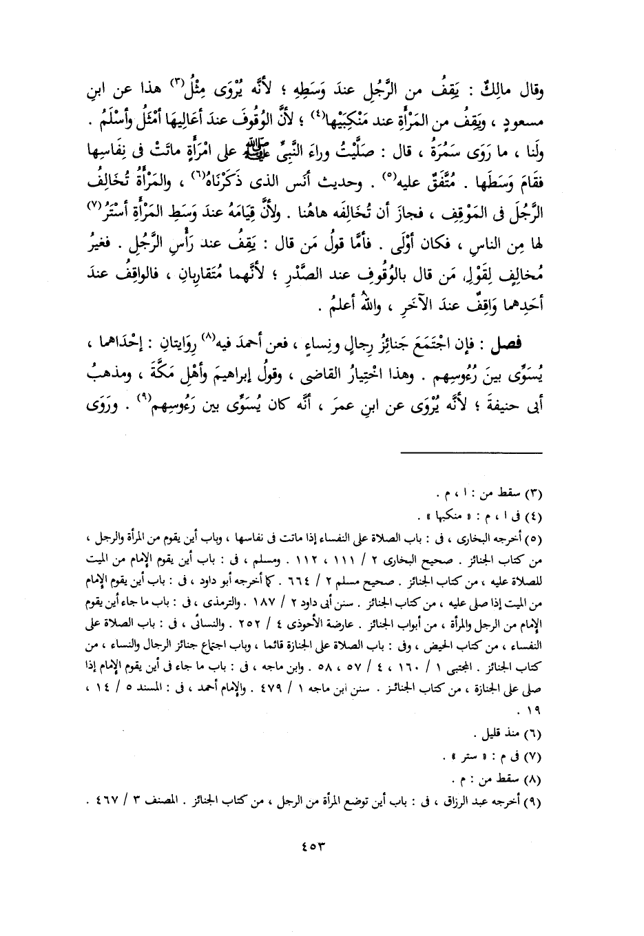 وقال مالِكٌ: يَقِفُ من الرَّجُلِ عندَ وَسَطِهِ؛ لأنَّه يُرْوَى مِثْلُ (٣) هذا عن ابنِ مسعودٍ، ويَقِفُ من المَرْأَةِ عند مَنْكِبَيْها (٤)؛ لأنَّ الوُقُوفَ عندَ أعَالِيهَا أَمْثَلُ وأسْلَمُ. ولَنا، ما رَوَى سَمُرَةُ، قال: صَلَّيْتُ وراءَ النَّبِيِّ -صلى اللَّه عليه وسلم- على امْرَأَةٍ ماتَتْ في نِفَاسِها فقَامَ وَسَطَها. مُتَّفَقٌ عليه (٥). وحديث أنَس الذي ذَكَرْنَاهُ (٦)، والمَرْأَةُ تُخَالِفُ الرُّجُلَ في المَوْقِفِ، فجازَ أن تُخَالِفَه ها هُنا. ولأنَّ قِيَامَهُ عندَ وَسَطِ المَرْأَةِ أسْتَرُ (٧) لها مِن الناسِ، فكان أوْلَى. فأمَّا قولُ مَن قال: يَقِفُ عند رَأْسِ الرَّجُلِ. فغيرُ مُخالِفٍ لِقَوْلِ مَن قال بالوُقُوفِ عند الصَّدْرِ؛ لأنَّهما مُتَقارِبَانِ، فالواقِفُ عندَ أحَدِهما وَاقِفٌ عندَ الآخَرِ، واللهُ أعلمُ.