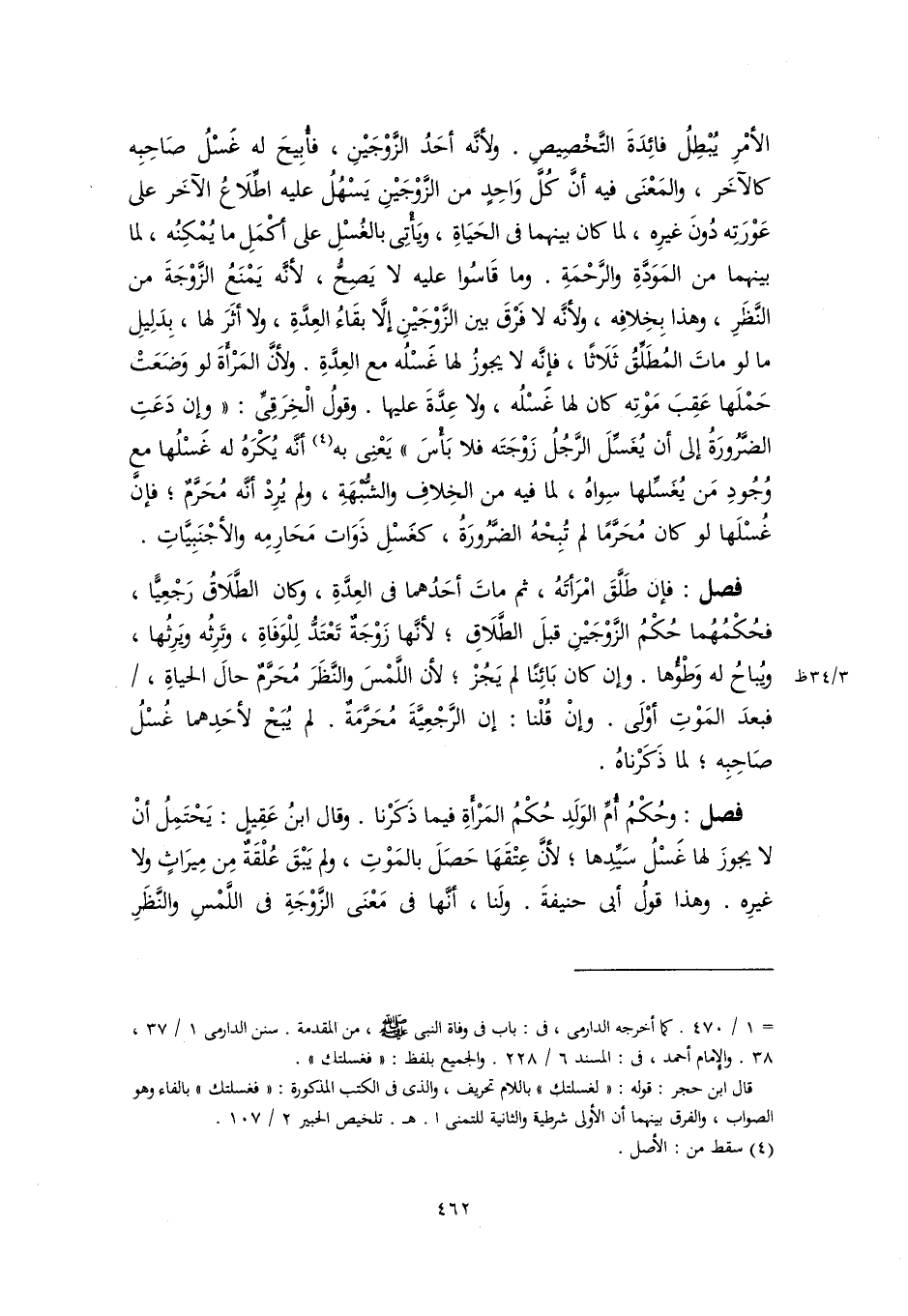 فصل: فإن طَلَّقَ امْرَأتَهُ، ثم ماتَ أحَدُهما في العِدَّةِ، وكان الطَّلَاقُ رَجْعِيًّا، فحُكْمُهُما حُكْمُ الزَّوْجَيْنِ قبلَ الطَّلَاقِ؛ لأنَّها زَوْجَةٌ تَعْتَدُّ لِلْوَفَاةِ، وتَرِثُه ويَرِثُها، ويُباحُ له وَطْؤُها. وإن كان بَائِنًا لم يَجُزْ؛ لأن اللَّمْسَ والنَّظَرَ مُحَرَّمٌ حالَ الحياةِ، فبعدَ المَوْتِ أوْلَى. وإنْ قُلْنا: إن الرَّجْعِيَّةَ مُحَرَّمَةٌ. لم يُبَحْ لأحَدِهما غُسْلُ صَاحِبِه؛ لما ذَكَرْناهُ.