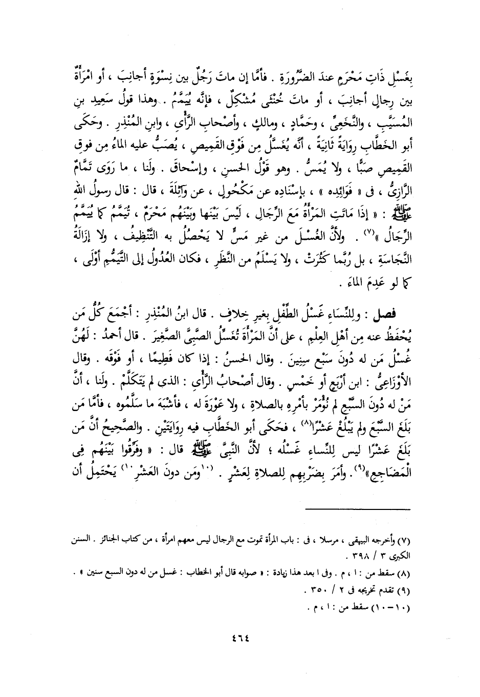 فصل: ولِلنِّسَاءِ غَسْلُ الطِّفْلِ بِغيرِ خِلافٍ. قال ابنُ المُنْذِرِ: أجْمَعَ كُلُّ مَن يُحْفَظُ عنه مِن أهْلِ العِلْمِ، على أنَّ المَرْأَةَ تُغَسِّلُ الصَّبِىَّ الصَّغِيرَ. قال أحمدُ: لَهُنَّ غُسْلُ مَن له دُونَ سَبْع سِنِينَ. وقال الحسنُ: إذا كان فَطِيمًا، أو فَوْقَه. وقال الأوْزَاعِىُّ: ابن أرْبَعٍ أو خَمْسٍ. وقال أصْحابُ الرَّأْىِ: الذي لم يَتَكَلَّمْ. ولَنا، أنَّ مَنْ له دُونَ السَّبْعِ لم نُؤْمَرْ بأمْرِهِ بالصلاةِ، ولا عَوْرَةَ له، فأشْبَهَ ما سَلَّمُوه، فأمَّا مَن بَلَغَ السَّبْعَ ولم يَبْلُغْ عَشْرًا (٨)، فحَكَى أبو الخَطَّابِ فيه رِوَايَتَيْنِ. والصَّحِيحُ أنَّ مَن بَلَغَ عَشْرًا ليس لِلنِّساءِ غَسْلُه؛ لأنَّ النَّبِىَّ -صلى اللَّه عليه وسلم- قال: "وفَرِّقُوا بَيْنَهُم فِي الْمَضَاجِعِ" (٩). وأمَرَ بِضَرْبِهِم لِلصلاةِ لِعَشْرٍ. [ومَن دونَ العَشْرِ] (١٠) يَحْتَمِلُ أن