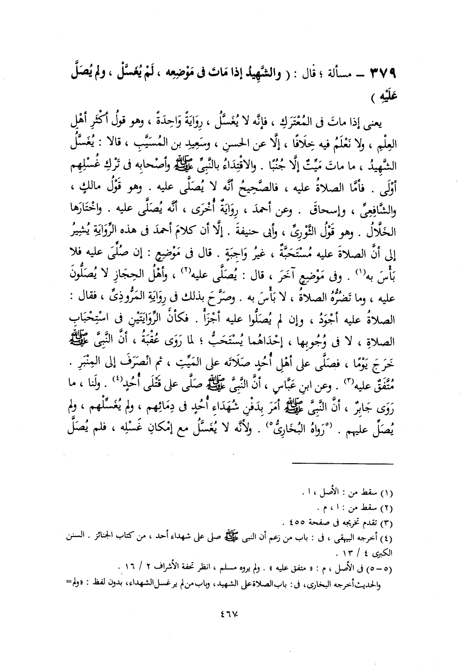 ٣٧٩ - مسألة؛ قال: (والشَّهِيدُ إذا مَاتَ في مَوْضِعِه، لَمْ يُغَسَّلْ، ولم يُصَلَّ عَلَيْهِ).
