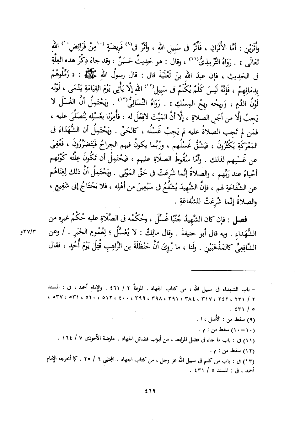 وأَثَرَيْنِ: أمَّا الأَثَرَانِ، فَأَثَرٌ في سَبِيلِ اللهِ، وأثَرٌ في (٩) فَرِيضَةٍ [مِنْ فَرَائِضِ] (١٠) اللهِ تَعَالَى". رَوَاهُ التِّرْمِذِىُّ (١١)، وقال: هو حَدِيثٌ حَسَنٌ، وقد جاءَ ذِكْرُ هذه العِلَّةِ في الحَدِيثِ، فإن عبدَ اللهِ بنَ ثَعْلَبَةَ قال: قال رسولُ اللهِ -صلى اللَّه عليه وسلم-: "زَمِّلُوهُمْ بِدِمَائِهِمْ، فَإنَّهُ لَيْسَ كَلْمٌ يُكْلَمُ في سَبِيلِ (١٢) اللهِ إلَّا يَأْتِى يَوْمَ القِيَامَةِ يَدْمَى، لَوْنُه لَوْنُ الدَّمِ، وَرِيحُه رِيحُ المِسْكِ". رَوَاهُ النَّسَائِىُّ (١٣). ويَحْتَمِلُ أنَّ الغُسْلَ لا يَجِبُ إلَّا من أجْلِ الصلاةِ، إلَّا أنَّ المَيِّتَ لا فِعْلَ له، فأُمِرْنَا بغَسْلِه لِنُصَلِّىَ عليه، فمَن لم تَجِب الصلاةُ عليه لم يَجِبْ غَسْلُه، كالحَىِّ. ويَحْتَمِلُ أن الشُّهَدَاءَ في المَعْرَكَةِ يَكْثُرُونَ، فيَشُقُّ غَسْلُهم، ورُبَّما يكونُ فيهم الجِراحُ فَيَتَضَرَّرُونَ، فَعُفِىَ عن غَسْلِهم لذلك. وأمَّا سُقُوطُ الصلَاةِ عليهم، فيَحْتَمِلُ أن تَكُونَ عِلَّتُه كَوْنَهم أحْياءً عند رَبِّهم، والصلاةُ إنَّما شُرِعَتْ في حَقِّ المَوْتَى. ويَحْتَمِلُ أنَّ ذلك لِغِنَاهُم عن الشَّفَاعَةِ لهم، فإنَّ الشَّهِيدَ يُشَفَّعُ في سَبْعِينَ من أهْلِه، فلا يَحْتَاجُ إلى شَفِيعٍ، والصلاةُ إنَّما شُرِعَتْ للشَّفاعَةِ.