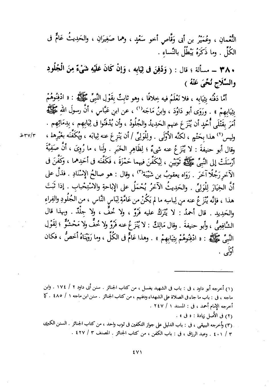 (١) أخرجه أبو داود، في: باب في الشهيد يغسل، من كتاب الجنائز. سنن أبي داود ٢/ ١٧٤. وابن ماجه، في: باب ما جاء في الصلاة على الشهداء ودفنهم، من كتاب الجنائز. سنن ابن ماجه ١/ ٤٨٥. كما أخرجه الإِمام أحمد، في: المسند ١/ ٢٤٧.