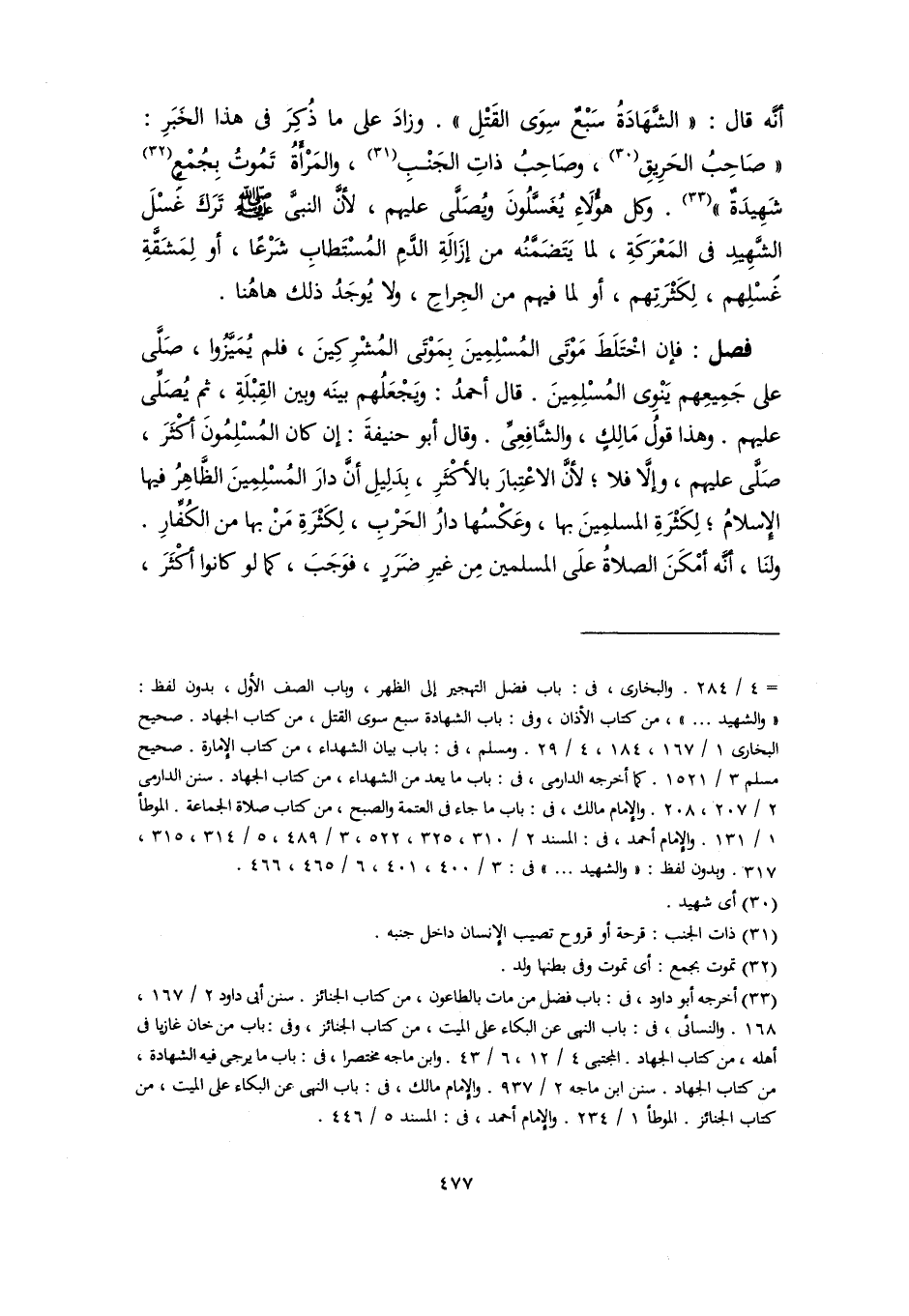 أنَّه قال: "الشَّهَادَةُ سَبْعٌ سِوَى القَتْلِ". وزادَ على ما ذُكِرَ في هذا الخَبَرِ: "صَاحِبُ الحَرِيقِ (٣٠)، وصَاحِبُ ذاتِ الجَنْبِ (٣١)، والمَرْأَةُ تَمُوتُ بِجُمْعٍ (٣٢) شَهِيدَةٌ" (٣٣). وكل هؤُلَاءِ يُغَسَّلُونَ ويُصَلَّى عليهم، لأنَّ النَّبِيَّ -صلى اللَّه عليه وسلم- تَرَكَ غَسْلَ الشَّهِيدِ في المَعْرَكَةِ، لما يَتَضَمَّنُه من إزَالَةِ الدَّمِ المُسْتَطابِ شَرْعًا، أو لِمَشَقَّةِ غَسْلِهم، لِكَثْرَتِهم، أو لما فيهم من الجِراحِ، ولا يُوجَدُ ذلك ها هُنا.