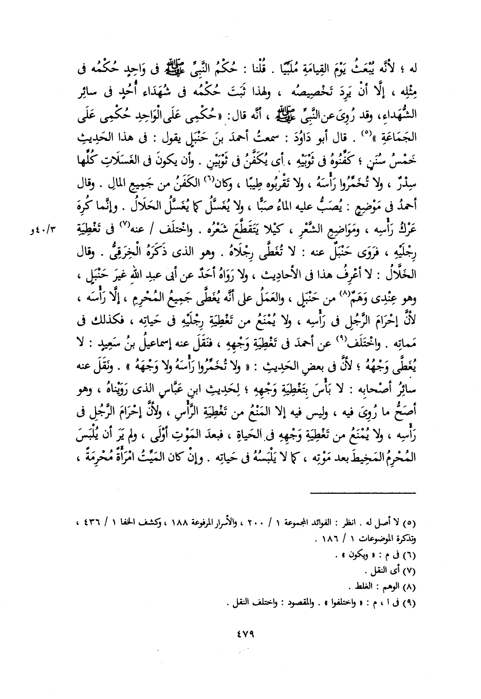 له؛ لأنَّه يُبْعَثُ يَوْمَ القِيامَةِ مُلَبِّيًا. قُلْنا: حُكْمُ النَّبِيِّ -صلى اللَّه عليه وسلم- في وَاحِدٍ حُكْمُه في مِثْلِه، إلَّا أنْ يَرِدَ تَخْصِيصُه، ولهذا ثَبَتَ حُكْمُه في شُهَدَاء أُحُدٍ في سائِر الشُّهَداءِ، وقد رُوِىَ عن النَّبِيِّ -صلى اللَّه عليه وسلم-، أنَّه قال: "حُكْمِى عَلَى الْوَاحِدِ حُكْمِى عَلَى الجَمَاعَةِ" (٥). قال أبو دَاوُدَ: سمعتُ أحمدَ بنَ حَنْبَلٍ يقول: في هذا الحَدِيثِ خَمْسُ سُنَنٍ؛ كَفِّنُوهُ في ثَوْبَيْهِ، أي يُكَفَّنُ في ثَوْبَيْنِ. وأن يكونَ في الغَسَلَاتِ كُلِّها سِدْرٌ، ولا تُخَمِّرُوا رَأْسَهُ، ولا تَقْربُوه طِيبًا، وكان (٦) الكَفَنُ من جَمِيعِ المالِ. وقال أحمدُ في مَوْضِعٍ: يُصَبُّ عليه الماءُ صَبًّا، ولا يُغَسَّلُ كما يُغَسَّلُ الحَلَالُ. وإنَّما كُرِهَ عَرْكُ رَأْسِه، ومَوَاضِعِ الشَّعْرِ، كيْلا يَتَقَطَّعَ شَعْرُه. واخْتلَف عنه (٧) في تَغْطِيَةِ رِجْلَيْهِ، فرَوَى حَنْبَلٌ عنه: لا تُغَطَّى رِجْلَاهُ. وهو الذي ذَكَرَهُ الْخِرَقِىُّ. وقال الخَلَّالُ: لا أعْرِفُ هذا في الأحادِيث، ولا رَوَاهُ أحَدٌ عن أبي عبدِ اللهِ غيرَ حَنْبَلٍ، وهو عِنْدِى وَهَمٌ (٨) من حَنْبَلٍ، والعَمَلُ على أنَّه يُغَطَّى جَمِيعُ المُحْرِمِ، إلَّا رَأْسَه، لأنَّ إحْرَامَ الرَّجُلِ في رَأْسِه، ولا يُمْنَعُ من تَغْطِيَةِ رِجْلَيْهِ في حَياتِه، فكذلك في مَماتِه. واخْتَلَف (٩) عن أحمدَ في تَغْطِيَةِ وَجْهِهِ، فنَقَلَ عنه إسماعيلُ بنُ سَعِيدٍ: لا يُغَطَّى وَجْهُهُ؛ لأنَّ في بعضِ الحَدِيثِ: "ولا تُخَمِّرُوا رَأْسَهُ ولا وَجْهَهُ". ونَقَلَ عنه سائِرُ أصْحابِه: لا بَأْسَ بِتَغْطِيَةِ وَجْهِهِ؛ لِحَدِيثِ ابنِ عَبَّاسٍ الذي رَوَيْناهُ، وهو أصَحُّ ما رُوِىَ فيه، وليس فيه إلا المَنْعُ من تَغْطِيَةِ الرَّأْسِ، ولأنَّ إحْرَامَ الرَّجُلِ في رَأْسِه، ولا يُمْنَعُ من تَغْطِيَةِ وَجْهِهِ في الحَياةِ، فبعدَ المَوْتِ أوْلَى، ولم يَرَ أن يُلْبَسَ المُحْرِمُ المَخِيطَ بعد مَوْتِه، كما لا يَلْبَسُهُ في حَياتِه. وإنْ كان المَيِّتُ امْرَأَةً مُحْرِمَةً،