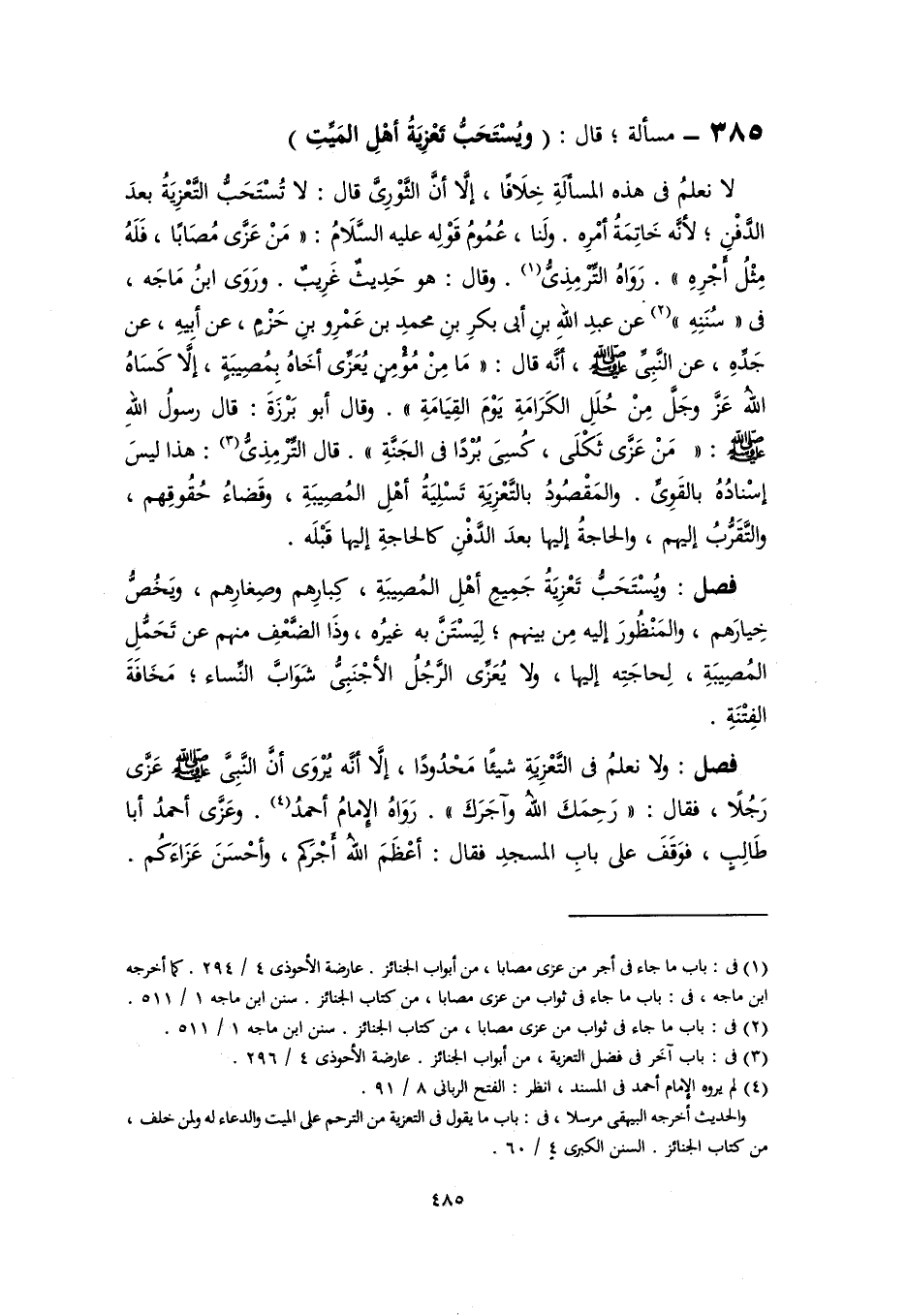 ٣٨٥ - مسألة؛ قال: (ويُسْتَحَبُّ تَعْزِيةُ أهْلِ المَيِّتِ)