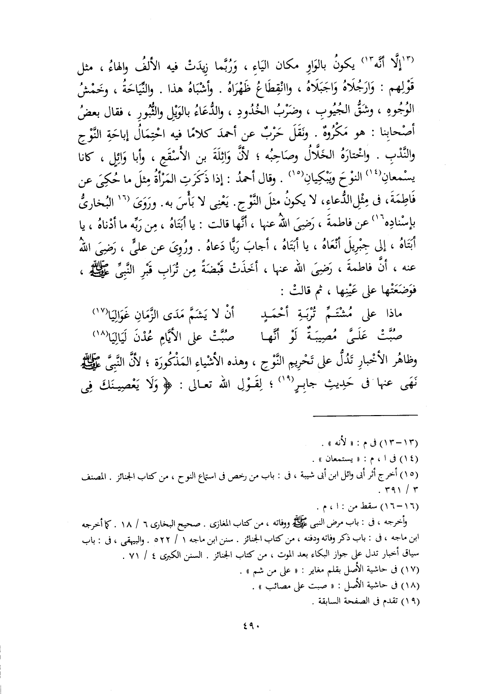 [إلَّا أنَّه] (١٣) يكونُ بالوَاوِ مكان اليَاءِ، وَرُبَّما زِيدَتْ فيه الألفُ والهاءُ، مثل قَوْلِهم: وَارَجُلَاهُ وَاجَبَلَاهُ، واانْقِطَاعُ ظَهْرَاهُ. وأشْبَاهُ هذا. والنِّيَاحَةُ، وخَمْشُ الوُجُوهِ، وشَقُّ الجُيُوبِ، وضَرْبُ الخُدُودِ، والدُّعَاءُ بالوَيْلِ والثُّبُورِ، فقال بعضُ أصْحابِنا: هو مَكْرُوهٌ. ونَقَلَ حَرْبٌ عن أحمدَ كلامًا فيه احْتِمَالُ إباحَةِ النَّوْحِ والنَّدْبِ. واخْتارَهُ الخَلَّالُ وصَاحِبُه؛ لأنَّ وَاثِلَةَ بن الأَسْقَعِ، وأبا وَائِلٍ، كانا يسْمعانِ (١٤) النوْحَ ويَبْكِيانِ (١٥). وقال أحمدُ: إدا ذَكَرَتِ المَرْأةُ مِثلَ ما حُكِىَ عن فَاطِمَةَ، في مِثْلِ الدُّعاءِ، لا يكونُ مثلَ النَّوْحِ. يَعْنِى لا بَأْسَ به. ورَوَىَ [البُخارىُّ بإسْنادِه] (١٦) عن فاطمةَ، رَضِىَ اللهُ عنها، أنَّها قالت: يا أَبَتَاهُ، مِن رَبِّه ما أدْناهُ، يا أبَتَاهُ، إلى جِبْرِيلَ أنعَاهُ، يا أَبَتَاهُ، أجابَ رَبًّا دَعاهُ. ورُوِىَ عن عليٍّ، رَضِىَ اللهُ عنه، أنَّ فاطمةَ، رَضِىَ اللَّه عنها، أخَذَتْ قَبْضَةً مِن تُرَابِ قَبْرِ النَّبِيِّ -صلى اللَّه عليه وسلم-، فوَضَعَتْها على عَيْنِها، ثم قالتْ: