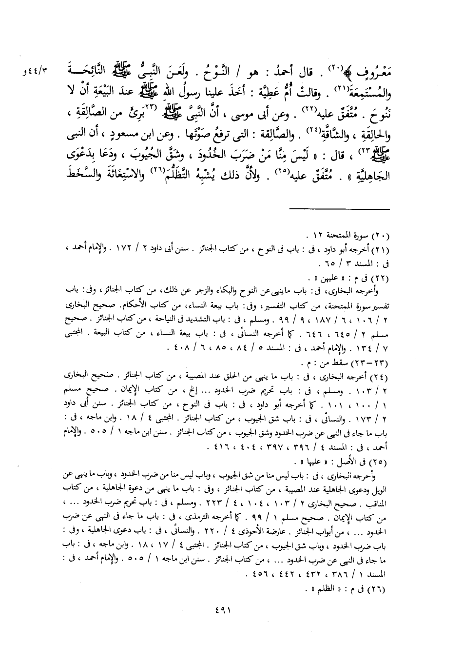 (٢١) أخرجه أبو داود، في: باب في النوح، من كتاب الجنائز. سنن أبي داود ٢/ ١٧٢. والإِمام أحمد، في: المسند ٣/ ٦٥.