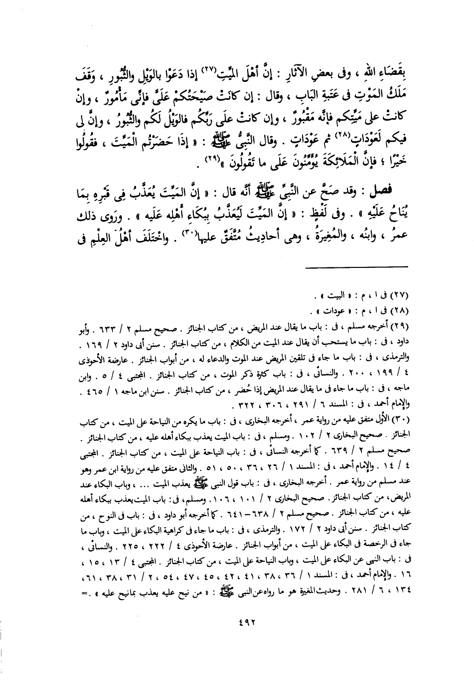 فصل: وقد صَحَّ عن النَّبِيِّ -صلى اللَّه عليه وسلم- أنَّه قال: "إنَّ الْمَيِّتَ يُعَذَّبُ في قَبْرِهِ بِمَا يُنَاحُ عَلَيْهِ". وفى لَفْظٍ: "إنَّ الْمَيِّتَ لَيُعَذَّبُ بِبُكَاءِ أَهْلِه عَلَيه". ورَوى ذلك عمرُ، وابنُه، والمُغِيرَةُ، وهى أحادِيثُ مُتَّفَقٌ عليها (٣٠). واخْتَلَفَ أهْلُ العِلْمِ في