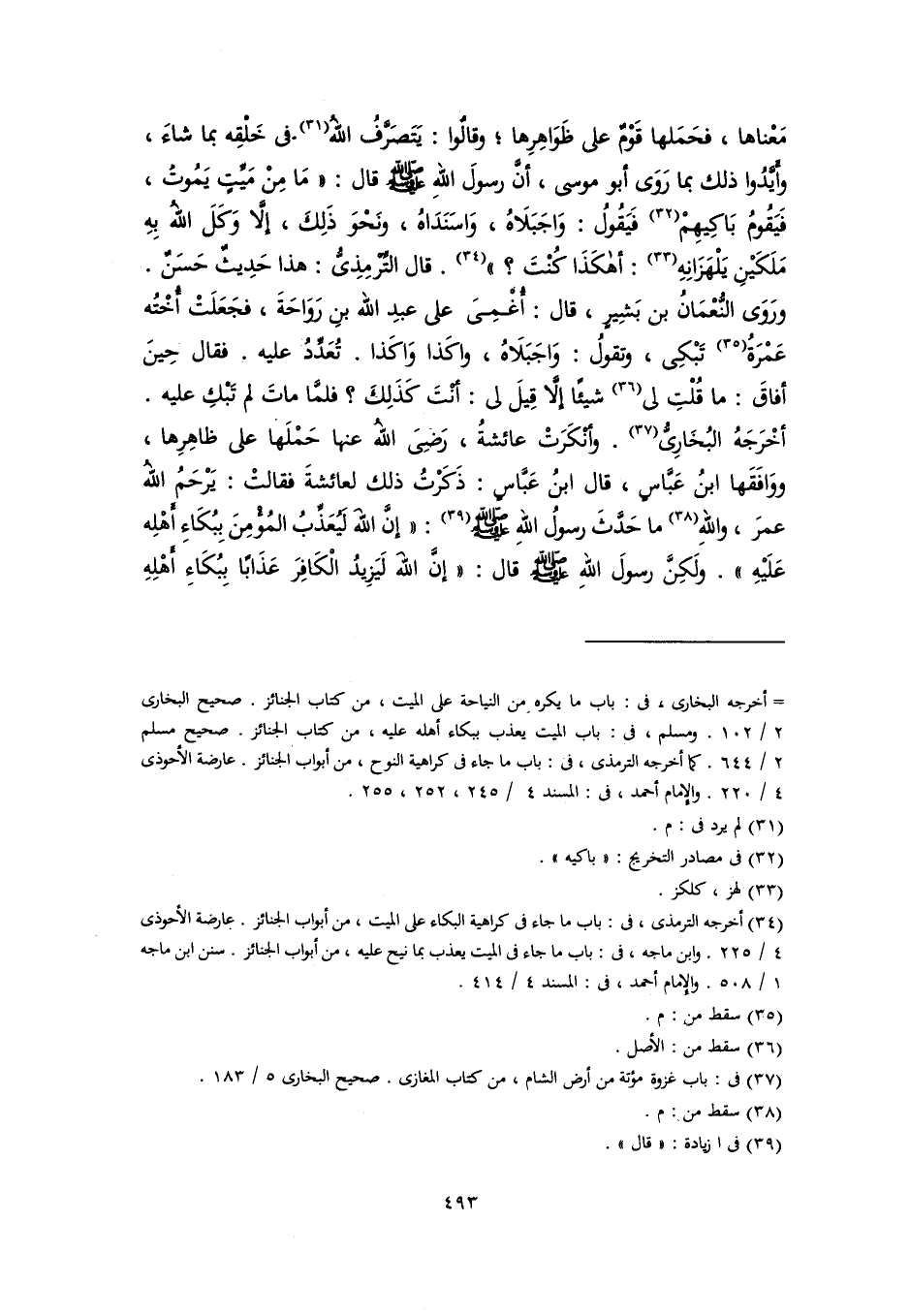 مَعْناها، فحَمَلها قَوْمٌ على ظَوَاهِرِها؛ وقالُوا: يَتَصَرَّفُ اللهُ (٣١) في خَلْقِه بما شاءَ، وأَيَّدُوا ذلك بما رَوَى أبو موسى، أنَّ رسولَ اللهِ -صلى اللَّه عليه وسلم- قال: "مَا مِنْ مَيِّتٍ يَمُوتُ، فَيَقُومُ بَاكِيهِمْ (٣٢) فَيَقُولُ: وَاجَبَلَاهُ، وَاسَنَدَاهُ، ونَحْوَ ذَلِكَ، إلَّا وَكَلَ اللهُ بِهِ مَلَكَيْنِ يَلْهَزَانِهِ (٣٣): أهكَذَا كُنْتَ؟ " (٣٤). قال التِّرْمِذِىُّ: هذا حَدِيثٌ حَسَنٌ. ورَوَى النُّعْمَانُ بن بَشِيرٍ، قال: أُغْمِىَ على عبدِ اللَّه بنِ رَوَاحَةَ، فجَعَلَتْ أُخْتُه عَمْرَةُ (٣٥) تَبْكِى، وتقولُ: وَاجَبَلَاهُ، واكَذا وَاكَذا. تُعَدِّدُ عليه. فقال حِينَ أفاقَ: ما قُلْتِ لي (٣٦) شيئًا إلَّا قِيلَ لي: أنْتَ كَذَلِكَ؟ فلمَّا ماتَ لم تَبْكِ عليه. أخْرَجَهُ البُخَارِىُّ (٣٧). وأنْكَرَتْ عائشةُ، رَضِىَ اللهُ عنها حَمْلَها على ظاهِرِها، ووَافَقَها ابنُ عَبَّاسٍ، قال ابنُ عَبَّاسٍ: ذَكَرْتُ ذلك لعائشةَ فقالتْ: يَرْحَمُ اللهُ عمرَ، واللهِ (٣٨) ما حَدَّث رسولُ اللهِ -صلى اللَّه عليه وسلم- (٣٩): "إنَّ اللهَ لَيُعَذِّبُ المُؤْمِنَ بِبُكَاءِ أَهْلِه عَلَيْهِ". ولَكِنَّ رسولَ اللهِ -صلى اللَّه عليه وسلم- قال: "إنَّ اللهَ لَيَزِيدُ الْكَافِرَ عَذَابًا بِبُكَاءِ أَهْلِهِ
