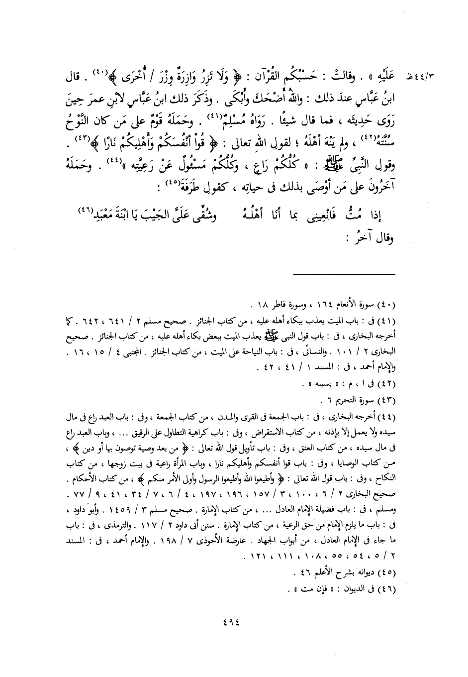 عَلَيْهِ". وقالتْ: حَسْبُكُمْ القُرْآن: {وَلَا تَزِرُ وَازِرَةٌ وِزْرَ أُخْرَى} (٤٠). قال ابنُ عَبَّاسٍ عندَ ذلك: واللهُ أَضْحَكَ وأَبْكَى. وذَكَرَ ذلك ابنُ عَبَّاسٍ لابنِ عمرَ حِينَ رَوَى حَدِيثَه، فما قال شيئًا. رَوَاهُ مُسْلِمٌ (٤١). وحَمَلَهُ قَوْمٌ على مَن كان النَّوْحُ سُنَّتَهُ (٤٢)، ولم يَنْهَ أهْلَهُ؛ لقولِ اللهِ تعالى: {قُوا أَنْفُسَكُمْ وَأَهْلِيكُمْ نَارًا} (٤٣). وقولِ النَّبِيِّ -صلى اللَّه عليه وسلم-: "كُلُّكُمْ رَاعٍ، وكُلُّكُمْ مَسْئُولٌ عَنْ رَعِيَّتِه" (٤٤). وحَمَلَهُ آخَرُونَ على مَن أَوْصَى بذلك في حياتِه، كقولِ طَرَفَةَ (٤٥):