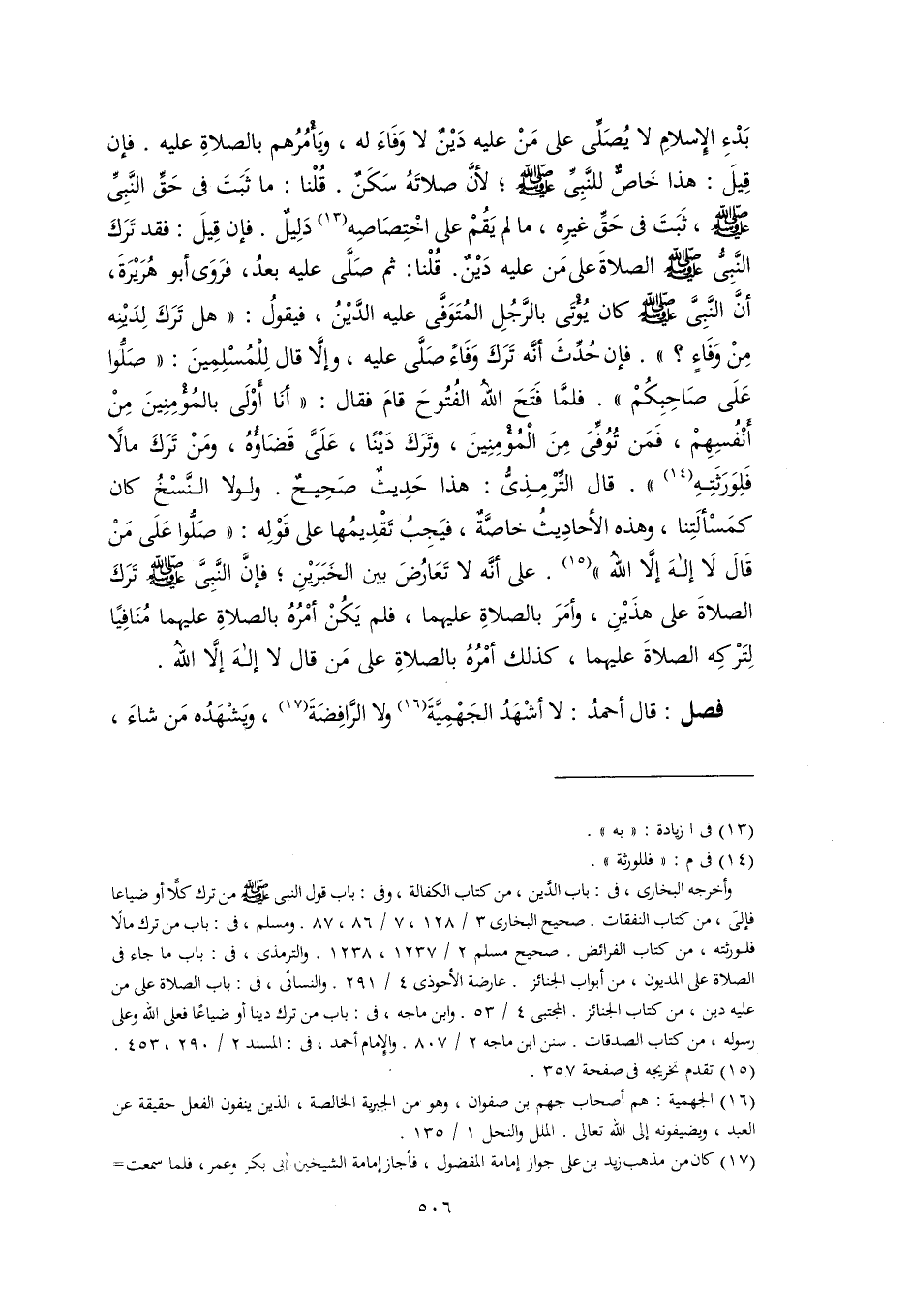 بَدْءِ الإِسلامِ لا يُصَلِّى على مَنْ عليه دَيْنٌ لا وَفَاءَ له، ويَأْمُرُهم بالصلاةِ عليه. فإن قِيلَ: هذا خَاصٌّ للنَّبِىِّ -صلى اللَّه عليه وسلم-؛ لأنَّ صلاتَهُ سَكَنٌ. قُلْنا: ما ثَبَتَ في حَقِّ النَّبِيِّ -صلى اللَّه عليه وسلم-، ثَبَتَ في حَقِّ غيرِه، ما لم يَقُمْ على اخْتِصَاصِه (١٣) دَلِيلٌ. فإن قِيلَ: فقد تَرَكَ النَّبِيُّ -صلى اللَّه عليه وسلم- الصلاةَ على مَن عليه دَيْنٌ. قُلْنا: ثم صَلَّى عليه بعدُ، فرَوَى أبو هُرَيْرَةَ، أنَّ النَّبِىَّ -صلى اللَّه عليه وسلم- كان يُؤْتَى بالرَّجُلِ المُتَوَفَّى عليه الدَّيْنُ، فيقولُ: "هل تَرَكَ لِدَيْنِه مِنْ وَفَاءٍ؟ ". فإن حُدِّثَ أنَّه تَرَكَ وَفَاءً صَلَّى عليه، وإلَّا قال لِلْمُسْلِمِينَ: "صَلُّوا عَلَى صَاحِبِكُمْ". فلمَّا فَتَحَ اللهُ الفُتُوحَ قامَ فقال: "أنَا أَوْلَى بالمُؤْمِنِينَ مِنْ أَنْفُسِهِمْ، فَمَن تُوُفِّىَ مِنَ الْمُؤْمِنِينَ، وتَرَكَ دَيْنًا، عَلَىَّ قَضَاؤُهُ، ومَنْ تَرَكَ مالًا فَلِوَرَثَتِهِ (١٤) ". قال التِّرْمِذِىُّ: هذا حَدِيثٌ صَحِيحٌ. ولولا النَّسْخُ كان كمَسْألَتِنا، وهذه الأحادِيثُ خاصَّةٌ، فيَجِبُ تَقْدِيمُها على قَوْلِه: "صَلُّوا عَلَى مَنْ قَالَ لَا إلهَ إلَّا اللهُ" (١٥). على أنَّه لا تَعَارُضَ بين الخَبَرَيْنِ؛ فإنَّ النَّبِىَّ -صلى اللَّه عليه وسلم- تَرَكَ الصلاةَ على هذَيْنِ، وأمَرَ بالصلاةِ عليهما، فلم يَكُنْ أمْرُهُ بالصلاةِ عليهما مُنَافِيًا لِتَرْكِه الصلاةَ عليهما، كذلك أمْرُهُ بالصلاةِ على مَن قال لا إلهَ إلَّا اللهُ.