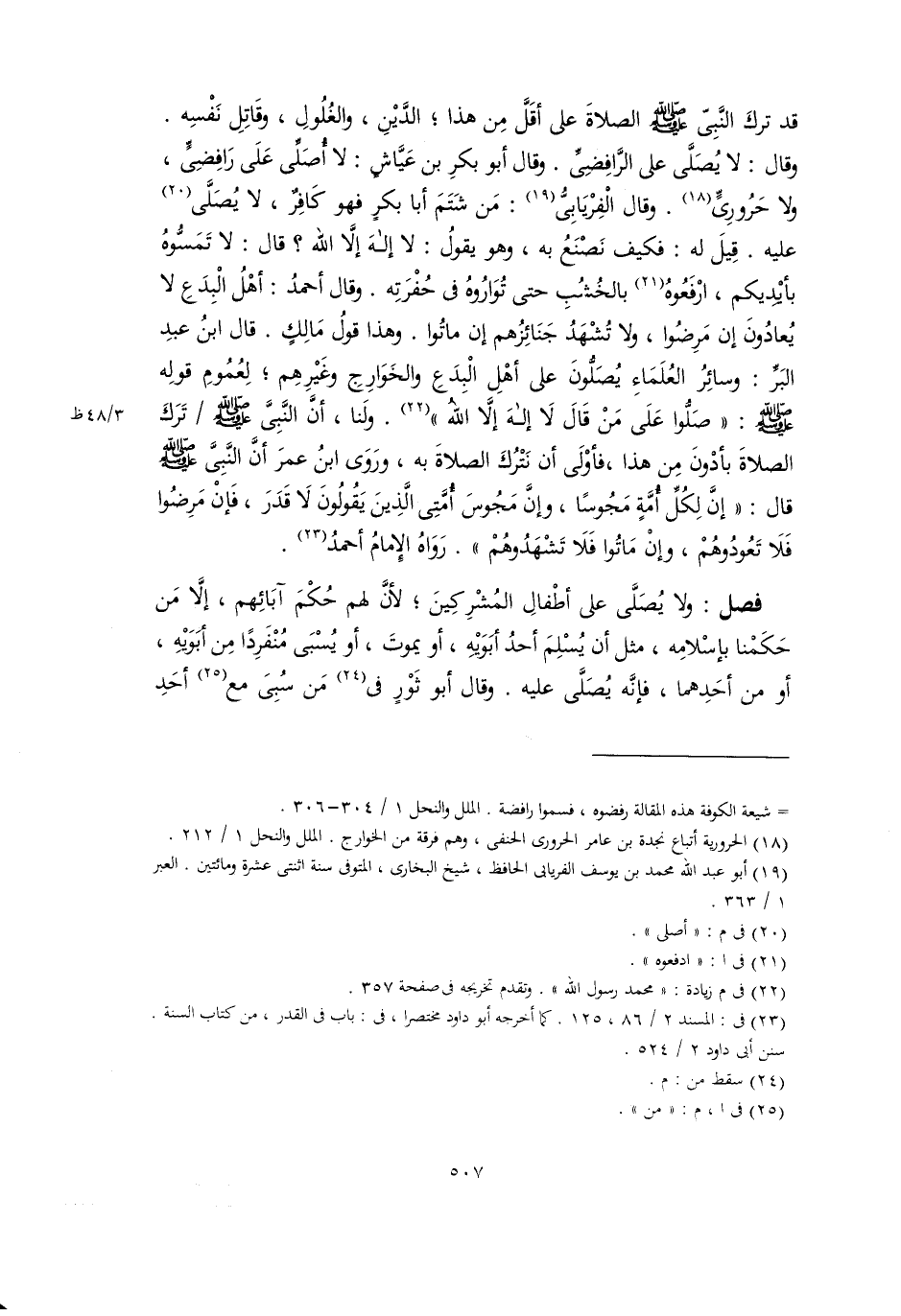 قد تركَ النَّبِىّ -صلى اللَّه عليه وسلم- الصلاةَ على أقَلَّ مِن هذا؛ الدَّيْنِ، والغُلُولِ، وقَاتِلِ نَفْسِه. وقال: لا يُصَلَّى على الرَّافِضِىِّ. وقال أبو بكرِ بن عَيَّاشٍ: لا أُصَلِّى عَلَى رَافِضِىٍّ، ولا حَرُورِىٍّ (١٨). وقال الْفِريَابِىُّ (١٩): مَن شَتَمَ أبا بكرٍ فهو كَافِرٌ، لا يُصَلَّى (٢٠) عليه. قِيلَ له: فكيف نَصْنَعُ به، وهو يقولُ: لا إلهَ إلَّا اللَّه؟ قال: لا تَمَسُّوهُ بأيْدِيكم، ارْفَعُوهُ (٢١) بالخُشُبِ حتى تُوَارُوهُ في حُفْرَتِه. وقال أحمدُ: أهْلُ الْبِدَعِ لا يُعادُونَ إن مَرِضُوا، ولا تُشْهَدُ جَنَائِزُهم إن ماتُوا. وهذا قولُ مَالِكٍ. قال ابنُ عبدِ البَرِّ: وسائِرُ العُلَمَاءِ يُصَلُّونَ على أهْلِ الْبِدَعِ والخَوَارِجِ وغَيْرِهِم؛ لِعُمُومِ قولِه -صلى اللَّه عليه وسلم-: "صَلُّوا عَلَى مَنْ قَالَ لَا إلهَ إلَّا اللهُ" (٢٢). ولَنا، أنَّ النَّبِىَّ -صلى اللَّه عليه وسلم- تَرَكَ الصلاةَ بأدْونَ مِن هذا، فأوْلَى أن نَتْرُكَ الصلاةَ به، ورَوَى ابنُ عمرَ أنَّ النَّبِىَّ -صلى اللَّه عليه وسلم- قال: "إنَّ لِكُلِّ أُمَّةٍ مَجُوسًا، وإنَّ مَجُوسَ أُمَّتِى الَّذِينَ يَقُولُونَ لَا قَدَرَ، فَإنْ مَرِضُوا فَلَا تَعُودُوهُمْ، وإنْ مَاتُوا فَلَا تَشْهَدُوهُمْ". رَوَاهُ الإِمامُ أحمدُ (٢٣).