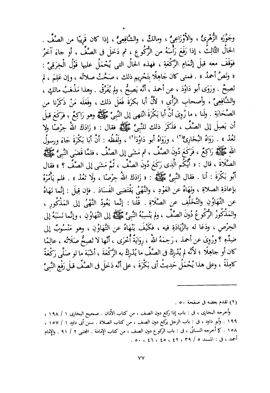 وجَوَّزَه الزُّهْرِىُّ، والأوْزَاعِىُّ، ومالكٌ، والشَّافِعِىُّ، إذا كان قَرِيبًا من الصَّفِّ. الحالُ الثَّالِثُ، إذا رَفَعَ رَأْسَهُ من الرُّكُوعِ، ثم دَخَلَ في الصَّفِّ، أو جاءَ آخَرُ فوَقَفَ معه قبلَ إتْمَامِ الرَّكْعَةِ، فهذه الحالُ التي يُحْمَلُ عليها قَوْلُ الْخِرَقِيِّ: "ونَصَّ أحمدُ". فمتى كان جَاهِلًا بِتَحْرِيمِ ذلك، صَحَّتْ صلاتُه، وإن عَلِمَ، لم تَصِحَّ. ورَوَى أبو دَاوُدَ، عن أحمدَ، أنَّه يَصِحُّ، ولم يُفَرِّقْ. وهذا مَذْهَبُ مالكٍ، والشَّافِعِىِّ، وأصحابِ الرَّأْىِ؛ لأنَّ أبا بكرَةَ فَعَلَ ذلك، وفَعَلَه مَنْ ذَكَرْنا من الصَّحَابَةِ. ولَنا، ما رُوِىَ أنَّ أبا بَكْرَةَ انْتَهى إلى النَّبِيِّ -صلى اللَّه عليه وسلم- وهو رَاكِعٌ، فرَكَعَ قبلَ أن يَصِلَ إلى الصَّفِّ، فذَكَرَ ذلك للنَّبِىِّ -صلى اللَّه عليه وسلم- فقال: "زَادَكَ اللهُ حِرْصًا ولا تَعُدْ". رَوَاهُ البُخَارِىُّ (٢)، ورَوَاهُ أبو دَاوُدَ (٢)، ولَفْظُه: أنَّ أَبَا بَكْرَةَ جَاءَ ورسولُ اللهِ -صلى اللَّه عليه وسلم- رَاكِعٌ، فَرَكَعَ دُونَ الصَّفِّ، ثم مَشَى إلى الصَّفِّ، فلمَّا قَضَى النَّبِىُّ -صلى اللَّه عليه وسلم- الصَّلَاةَ، قال: "أَيُّكُم الَّذِى رَكَعَ دُونَ الصَّفِّ، ثُمَّ مَشَى إلى الصَّفِّ؟ " فقال أبُو بَكْرَةَ: أنا. فقال النَّبِيُّ -صلى اللَّه عليه وسلم-: "زَادَكَ اللهُ حِرْصًا، ولَا تَعُدْ". فلم يَأْمُرْهُ بإعادَةِ الصلاةِ، ونَهَاهُ عن العَوْدِ، والنَّهْىُ يَقْتَضِى الفَسَادَ. فإن قِيلَ: إنَّما نَهَاهُ عن التَّهَاوُنِ والتَّخَلُّفِ عن الصَّلَاةِ قُلْنا: إنَّما يَعُودُ النَّهْىُ إلى المَذْكُورِ، والمَذْكُورُ الرُّكُوعُ دُونَ الصَّفِّ، ولم يَنْسِبْهُ النَّبِىُّ -صلى اللَّه عليه وسلم- إلى التَّهَاوُنِ، وإنَّما نَسَبَهُ إلى الحِرْصِ، ودَعَا له بالزِّيَادَةِ فيه، فكَيْفَ يَنْهَاهُ عن التَّهَاوُنِ، وهو مَنْسُوبٌ إلى ضِدِّهِ؟ ورُوِىَ عن أحمدَ، رَحِمَهُ اللهُ، رِوَايَةٌ أُخْرَى، أنَّها لا تَصِحُّ صَلَاتُه، عالِمًا كان أو جاهِلًا؛ لأنَّه لم يُدْرِكْ في الصَّفِّ ما يُدْرِكُ به الرَّكَعَةَ، أشْبَهَ ما لو صَلَّى رَكْعَةً كامِلَةً، وعلى هذا يُحْمَلُ حَدِيثُ أبي بَكْرَةَ، على أنَّه دَخَلَ في الصَّفِّ قبلَ رَفْعِ النَّبِيِّ