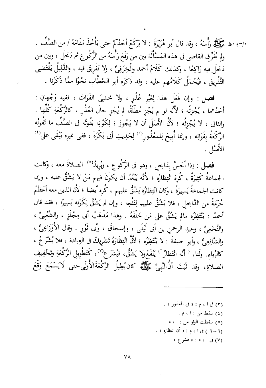 -صلى اللَّه عليه وسلم- رَأْسَهُ، وقد قال أبو هُرَيْرَةَ: لا يَرْكَعْ أحَدُكم حتَّى يَأْخُذَ مَقَامَهُ من الصَّفِّ. ولم يُفَرِّقِ القاضي في هذه المَسْأَلَة بين من رَفَعَ رَأْسَهُ من الرُّكُوعِ ثم دَخَلَ، وبين من دَخَلَ فيه رَاكِعًا، وكذلك كَلَامُ أحمد والْخِرَقِىِّ، ولا تَفْرِيقَ فيه، والدَّلِيلُ يَقْتَضِى التَّفْرِيقَ، فيُحْمَلُ كَلَامُهم عليه، وقد ذَكَرَه أبو الخَطَّابِ نحْوًا ممَّا ذَكَرْنا.