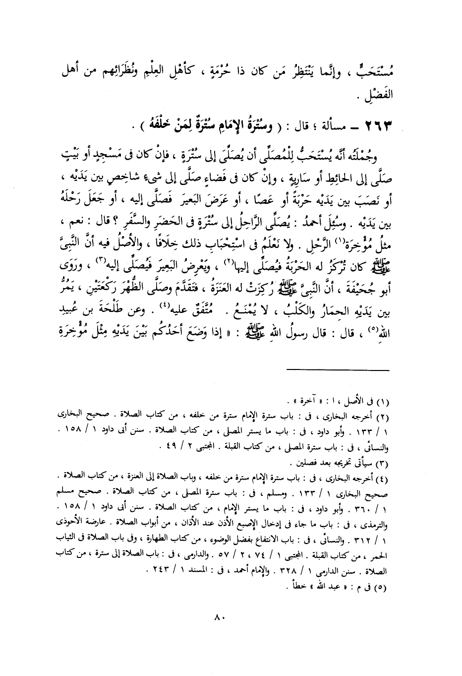 ٢٦٣ - مسألة؛ قال: (وسُتْرَةُ الإِمَامِ سُتْرَةٌ لِمَنْ خلْفَهُ).