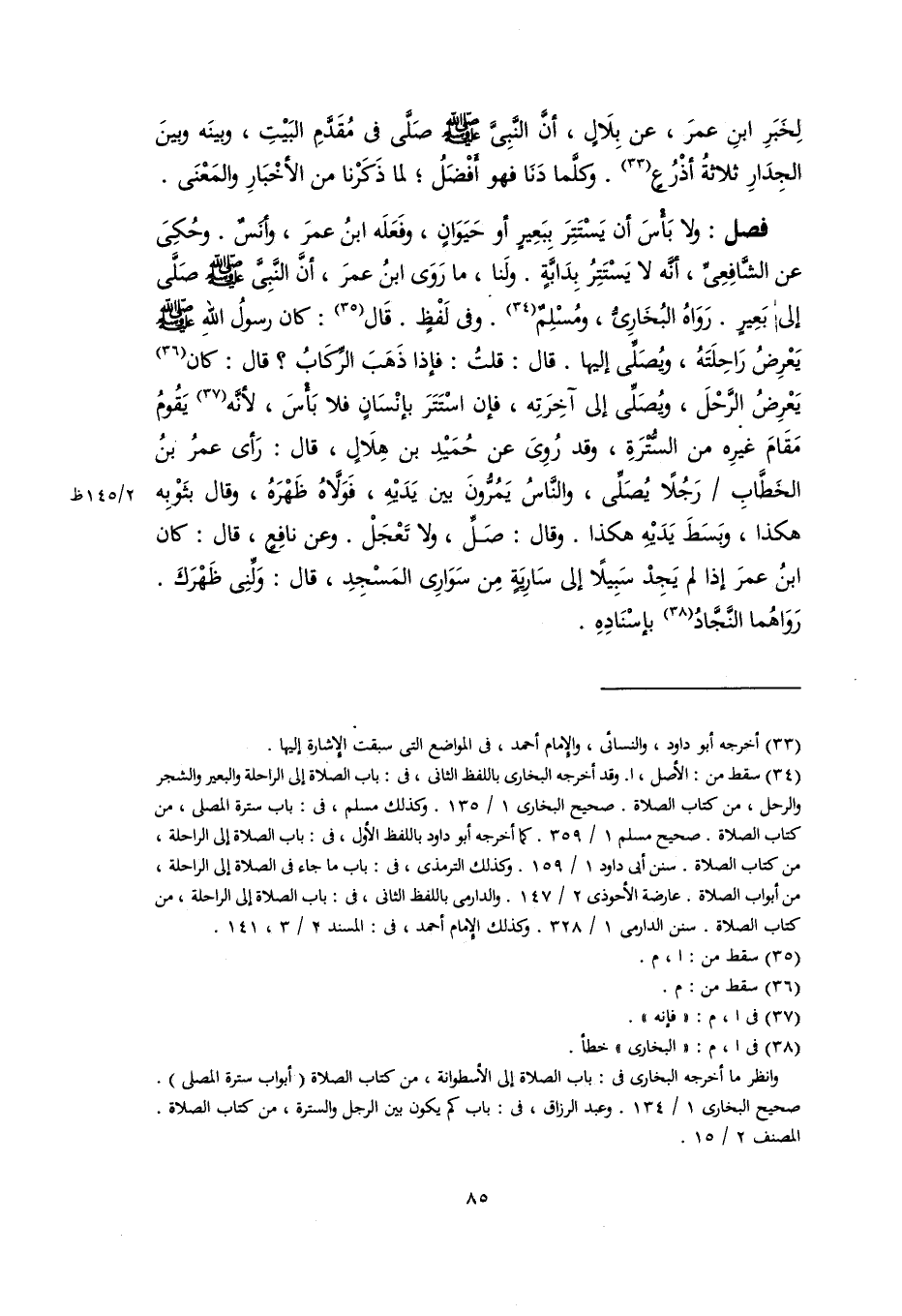 (٣٤) سقط من: الأصل، أ. وقد أخرجه البخاري باللفظ الثاني، في: باب الصلاة إلى الراحلة والبعير والشجر والرحل، من كتاب الصلاة. صحيح البخاري ١/ ١٣٥. وكذلك مسلم، في: باب سترة المصلى، من كتاب الصلاة. صحيح مسلم ١/ ٣٥٩. كما أخرجه أبو داود باللفظ الأول، في: باب الصلاة إلى الراحلة، من كتاب الصلاة. سنن أبي داود ١/ ١٥٩. وكذلك الترمذي، في: باب ما جاء في الصلاة إلى الراحلة، من أبواب الصلاة. عارضة الأحوذى ٢/ ١٤٧. والدارمى باللفظ الثاني، في: باب الصلاة إلى الراحلة، من كتاب الصلاة. سنن الدارمي ١/ ٣٢٨. وكذلك الإِمام أحمد، في: المسند ٢/ ٣، ١٤١.