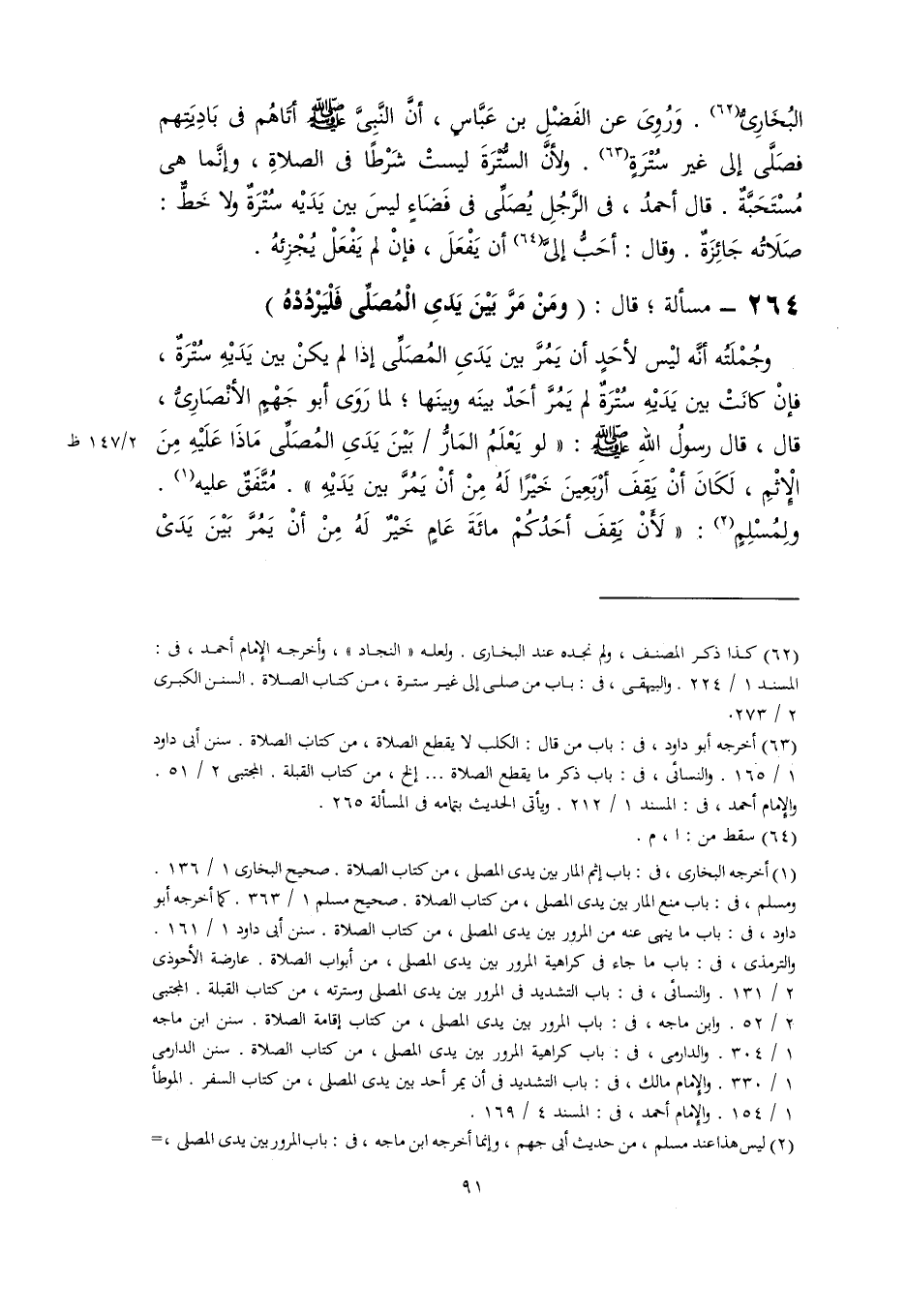 البُخَارِىُّ (٦٢). وَرُوِىَ عن الفَضْلِ بن عَبَّاسٍ، أنَّ النَّبِىَّ -صلى اللَّه عليه وسلم- أتَاهُم في بَادِيَتِهم فصَلَّى إلى غير سُتْرَةٍ (٦٣). ولأنَّ السُّتْرَةَ ليستْ شَرْطًا في الصلاةِ، وإنَّما هي مُسْتَحَبَّةٌ. قال أحمدُ، في الرَّجُلِ يُصَلِّى في فَضَاءٍ ليسَ بين يَدَيْه سُتْرَةٌ ولا خَطٌّ: صَلَاتُه جَائِزَةٌ. وقال: أحَبُّ إليَّ (٦٤) أن يَفْعَلَ، فإنْ لم يَفْعَلْ يُجْزِئهُ.