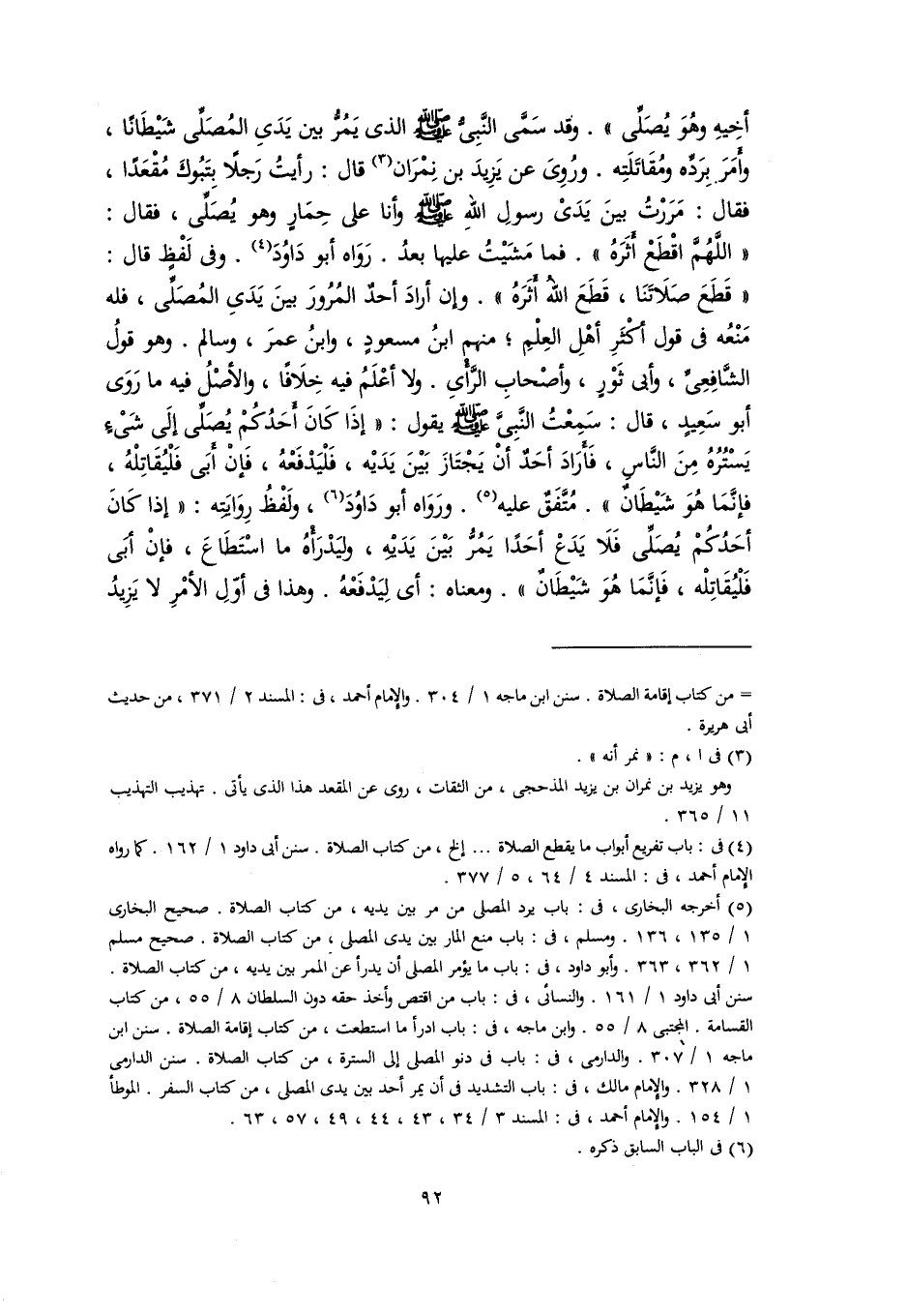 (٥) أخرجه البخاري، في: باب يرد المصلى من مر بين يديه، من كتاب الصلاة. صحيح البخاري ١/ ١٣٥، ١٣٦. ومسلم، في: باب منع المار بين يدى المصلى، من كتاب الصلاة. صحيح مسلم ١/ ٣٦٢، ٣٦٣. وأبو داود، في: باب ما يؤمر المصلى أن يدرأ عن الممر بين يديه، من كتاب الصلاة. سنن أبي داود ١/ ١٦١. والنسائي، في: باب من اقتص وأخذ حقه دون السلطان ٨/ ٥٥، من كتاب القسامة. المجتبى ٨/ ٥٥. وابن ماجه، في: باب ادرأ ما استطعت، من كتاب إقامة الصلاة. سنن ابن ماجه ١/ ٣٠٧. والدارمى، في: باب في دنو المصلى إلى السترة، من كتاب الصلاة. سنن الدارمي ١/ ٣٢٨. والإِمام مالك، في: باب التشديد في أن يمر أحد بين يدى المصلى، من كتاب السفر. الموطأ ١/ ١٥٤. والإِمام أحمد، في: المسند ٣/ ٣٤، ٤٣، ٤٤، ٤٩، ٥٧، ٦٣.