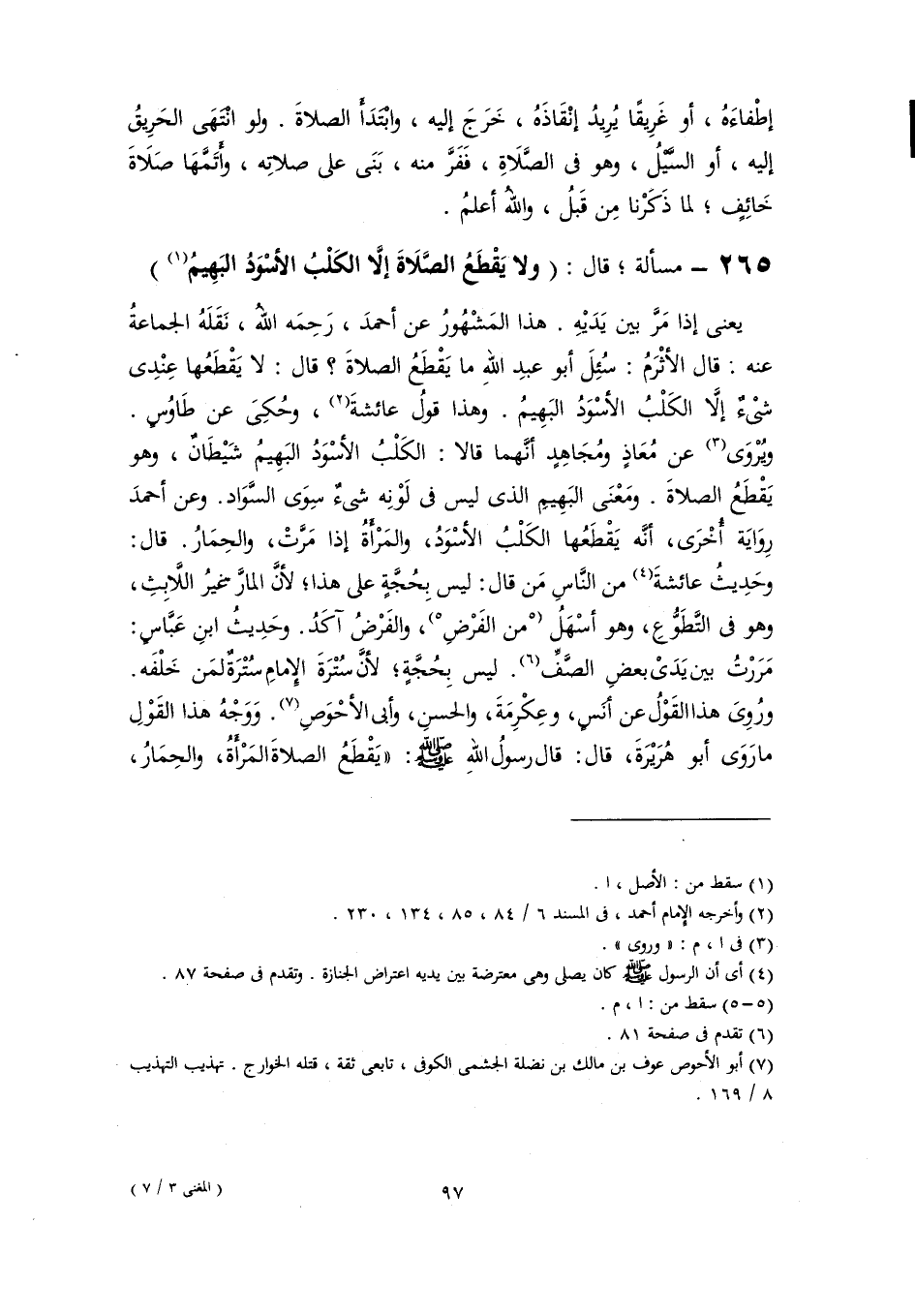 ٢٦٥ - مسألة؛ قال: (ولا يَقْطَعُ الصَّلَاةَ إلَّا الكَلْبُ الأسْوَدُ البَهِيمُ (١))