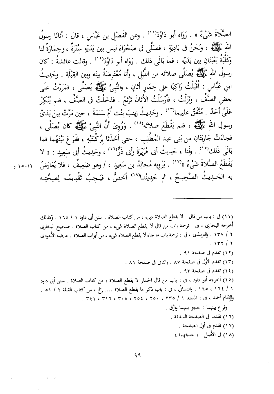 (١٥) أخرجه أبو داود، في: باب من قال الحمار لا يقطع الصلاة، من كتاب الصلاة. سنن أبي داود ١/ ١٦٤، ١٦٥. والنسائي، في: باب ذكر ما يقطع الصلاة. . . . إلخ، من كتاب القبلة ٢/ ٥١. والإِمام أحمد، في: المسند ١/ ٢٣٥, ٢٥٠، ٢٥٤، ٣٠٨، ٣١٦، ٣٤١.