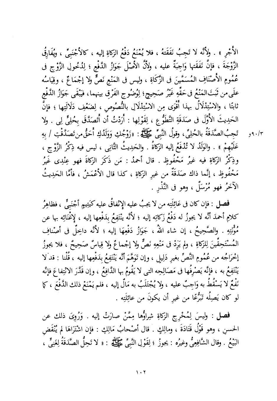 الأجْرِ". ولأنَّه لا تَجِبُ نَفَقَتهُ، فلا يُمْنَعُ دَفْعُ الزَّكاةِ إليه، كالأجْنَبِيِّ، ويُفَارِقُ الزَّوْجَةَ، فإنَّ نَفَقَتها وَاجِبَةٌ عليه، ولأنَّ الأصْلَ جَوَازُ الدَّفْعِ؛ لِدُخُولِ الزَّوْجِ في عُمُومِ الأصْنَافِ المُسَمَّينَ في الزَّكَاةِ، وليس في المَنْعِ نَصٌّ ولا إجْمَاعٌ، وقِيَاسُه علَى من ثَبَتَ المَنْعُ في حَقِّهِ غَيْرُ صَحِيحٍ؛ لِوُضُوحِ الفَرْقِ بينهما، فيَبْقَى جَوَازُ الدَّفْعِ ثابتًا، والاسْتِدْلَالُ بهذا أقوَى مِن الاسْتِدْلَالِ بالنُّصُوصِ، لِضَعْفِ دَلَالَتِها؛ فإنَّ الحَدِيثَ الأوَّلَ في صَدَقَةِ التَّطَوُّعِ، لِقَوْلِها: أرَدْتُ أن أتَصَدَّقَ بِحُلِيٍّ لِي. ولا تَجِبُ الصَّدَقَةُ بالحُلِيِّ، وقولُ النَّبِيِّ -صَلَّى اللهُ عَلَيْهِ وَسَلَّمَ-: "زَوْجُكِ وَوَلَدُكِ أحَقُّ من تَصَدَّقْتِ بِهِ عَلَيْهِمْ". والوَلَدُ لا تُدْفَعُ إليه الزكاةُ. والحَدِيثُ الثَّانِي، ليس فيه ذِكْرُ الزَّوْجِ، وذِكْرُ الزَّكاةِ فيه غيرُ مَحْفُوظٍ. قال أحمدُ: مَن ذَكَرَ الزكاةَ فهو عِنْدِي غيرُ مَحْفُوظٍ، إنَّما ذاك صَدَقَةٌ من غيرِ الزكاةِ، كذا قال الأعْمَشُ، فأمَّا الحَدِيثُ الآخَرُ فهو مُرْسَلٌ، وهو في النَّذْرِ.