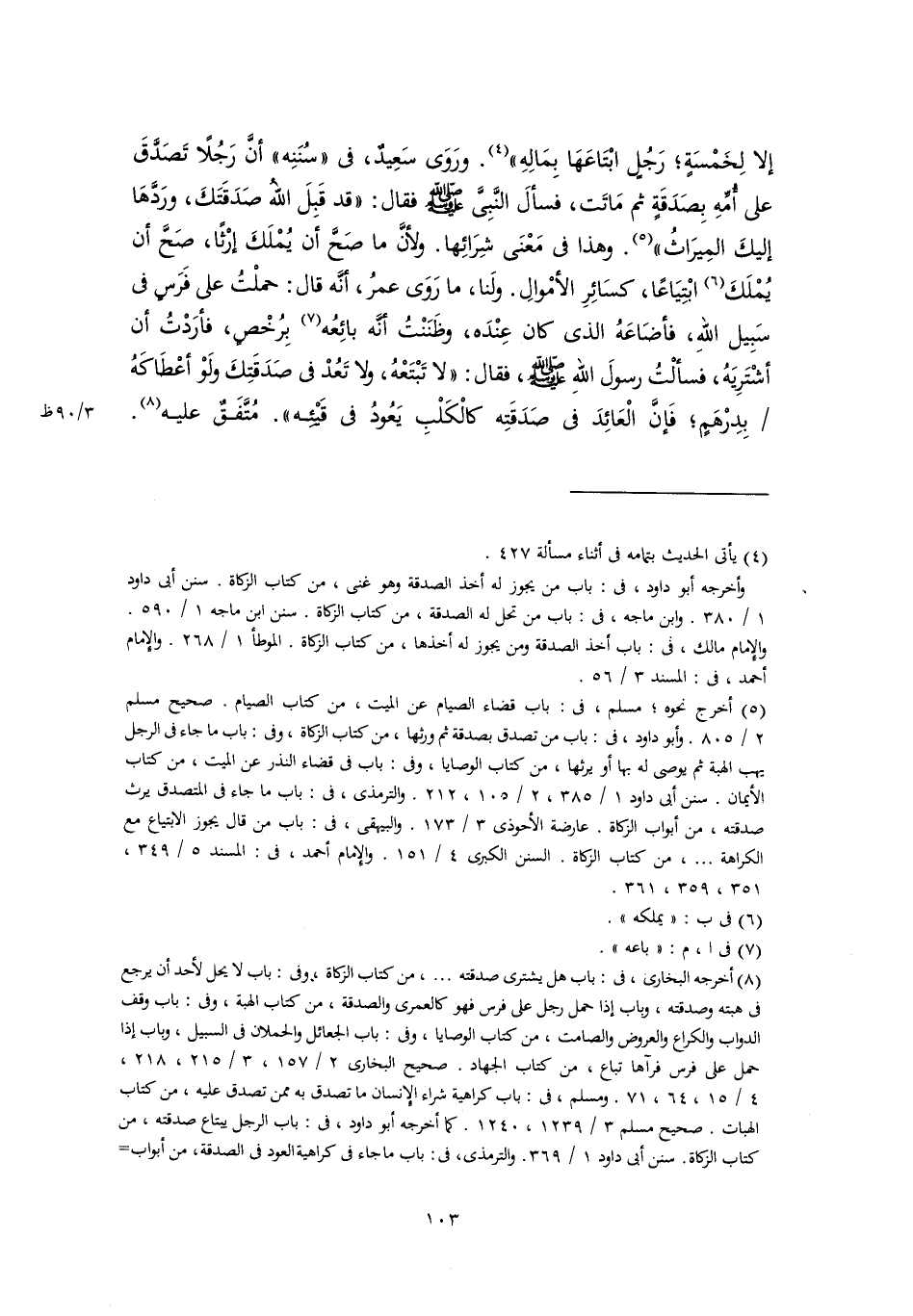 (٨) أخرجه البخاري، في: باب هل يشترى صدقته. . .، من كتاب الزكاة، وفي: باب لا يحل لأحد أن يرجع في هبته وصدقته، وباب إذا حمل رجل على فرس فهو كالعمرى والصدقة، من كتاب الهبة، وفي: باب وقف الدواب والكراع والعروض والصامت، من كتاب الوصايا، وفي: باب الجعائل والحملان في السبيل، وباب إذا حمل على فرس فرآها تباع، من كتاب الجهاد. صحيح البخاري ٢/ ١٥٧، ٣/ ٢١٥، ٢١٨، ٤/ ١٥، ٦٤، ٧١. ومسلم، في: باب كراهية شراء الإنسان ما تصدق به ممن تصدق عليه، من كتاب الهبات. صحيح مسلم ٣/ ١٢٣٩، ١٢٤٠. كما أخرجه أبو داود، في: باب الرجل يبتاع صدقته، من كتاب الزكاة. سنن أبي داود ١/ ٣٦٩. والترمذي، في: باب ما جاء في كراهية العود في الصدقة، من أبواب=