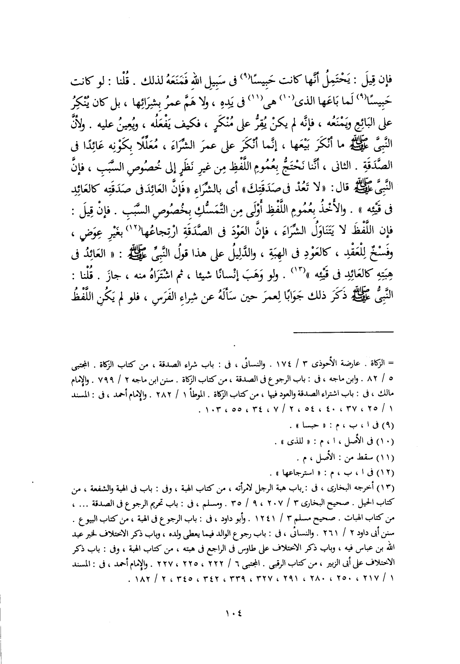 فإن قِيلَ: يحتمِلُ أنَّها كانت حَبِيسًا (٩) في سَبِيلِ اللهِ فَمَنَعَهُ لذلك. قُلْنا: لو كانت حَبِيسًا (٩) لَما بَاعَها الذي (١٠) هي (١١) في يَدهِ، ولا هَمَّ عمرُ بِشِرَائِها، بل كان يُنْكِرُ على البَائِعِ ويَمْنَعُه، فإنَّه لم يكنْ يُقِرُّ على مُنْكَرٍ، فكيف يَفْعَلُه، ويُعِينُ عليه. ولأنَّ النَّبِيَّ -صَلَّى اللهُ عَلَيْهِ وَسَلَّمَ- ما أنكَرَ بَيْعَها، إنَّما أنْكَرَ على عمرَ الشِّرَاءَ، مُعَلِّلًا بِكَوْنِه عَائِدًا في الصَّدَقَةِ. الثاني، أنَّنا نَحْتَجُّ بِعُمُومِ اللَّفْظِ مِن غيرِ نَظَرٍ إلى خُصُوصِ السَّبَبِ، فإنَّ النَّبِيَّ -صَلَّى اللهُ عَلَيْهِ وَسَلَّمَ- قال: "لا تَعُدْ في صَدَقَتِكَ" أي بالشِّرَاءِ "فَإنَّ العَائِدَ في صَدَقَتِه كالعَائِدِ في قَيْئِه". والأخْذُ بِعُمُومِ اللَّفْظِ أَوْلَى مِن التَّمَسُّكِ بِخُصُوصِ السَّبَبِ. فإنْ قِيلَ: فإن اللَّفْظَ لا يَتَنَاوَلُ الشِّرَاءَ، فإنَّ العَوْدَ في الصَّدَقَةِ ارْتِجاعُها (١٢) بغَيْرِ عِوَضٍ، وفَسْخٌ لِلْعَقْدِ، كالعَوْدِ في الهِبَةِ، والدَّلِيلُ على هذا قولُ النَّبِيِّ -صَلَّى اللهُ عَلَيْهِ وَسَلَّمَ-: "العَائِدُ في هِبَتِهِ كالعَائِدِ في قَيْئِه" (١٣). ولو وَهَبَ إنْسانًا شيئًا، ثم اشْتَرَاهُ منه، جازَ. قُلْنا: النَّبِيُّ -صَلَّى اللهُ عَلَيْهِ وَسَلَّمَ- ذَكَرَ ذلك جَوَابًا لِعمرَ حين سَألَهُ عن شِراءِ الفَرَسِ، فلو لم يَكُنِ اللَّفْظُ