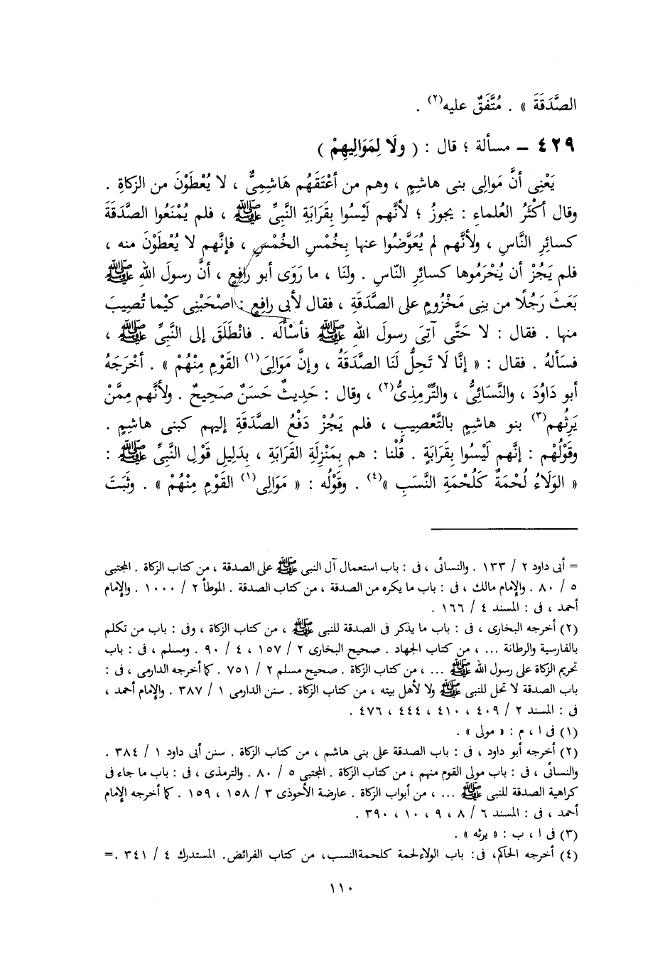 = أبي داود ٢/ ١٣٣. والنسائي، في: باب استعمال آل النبي -صَلَّى اللهُ عَلَيْهِ وَسَلَّمَ- على الصدقة، من كتاب الزكاة. المجتبى ٥/ ٨٠. والإمام مالك، في: باب ما يكره من الصدقة، من كتاب الصدقة. الموطأ ٢/ ١٠٠٠. والإمام أحمد، في: المسند ٤/ ١٦٦.