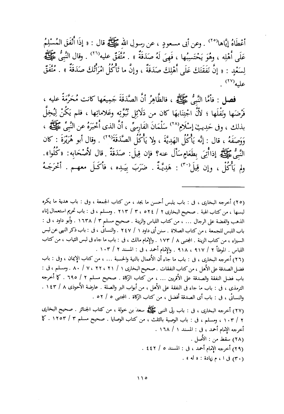 فصل: فأمَّا النَّبِيُّ -صَلَّى اللهُ عَلَيْهِ وَسَلَّمَ-، فالظَّاهِرُ أنَّ الصَّدَقَةَ جَمِيعَها كانت مُحَرَّمَةً عليه، فَرْضَها ونَفْلَها؛ لأنَّ اجْتِنَابهَا كان من دَلَائِلِ نُبُوَّتِه وعَلاماتِها، فلم يَكُنْ لِيُخِلَّ بذلك، وفي حَدِيثِ إسْلَامِ (٢٨) سَلْمَانَ الفَارِسيِّ، أنَّ الذي أخْبَرَهُ عن النَّبِيِّ -صَلَّى اللهُ عَلَيْهِ وَسَلَّمَ- وَوَصَفَهُ، قال: إنَّه يَأْكُلُ الهَدِيَّةَ، ولا يَأْكُلُ الصَّدَقَةَ (٢٩). وقال أبو هُرَيْرَةَ: كان النَّبِيُّ -صَلَّى اللهُ عَلَيْهِ وَسَلَّمَ- إذا أُتِيَ بِطَعَامٍ سَألَ عنه؟ فإن قِيلَ: صَدَقَةٌ. قال لأصْحَابِه: "كُلُوا". ولم يَأْكُلْ، وإن قِيلَ (٣٠): هَدِيَّةٌ. ضَرَبَ بِيَدِه، فأكَلَ معهم. أخْرَجَهُ