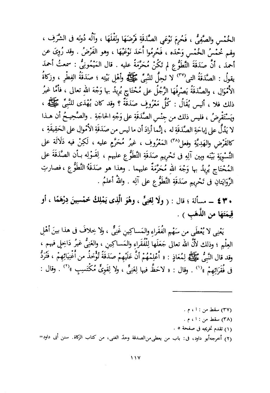 ٤٣٠ - مسألة؛ قال: (ولَا لِغَنِيٍّ، وهُوَ الذِي يَمْلِكُ خَمْسِينَ دِرْهَمًا، أو قِيمَتَهَا من الذَّهَبِ).
