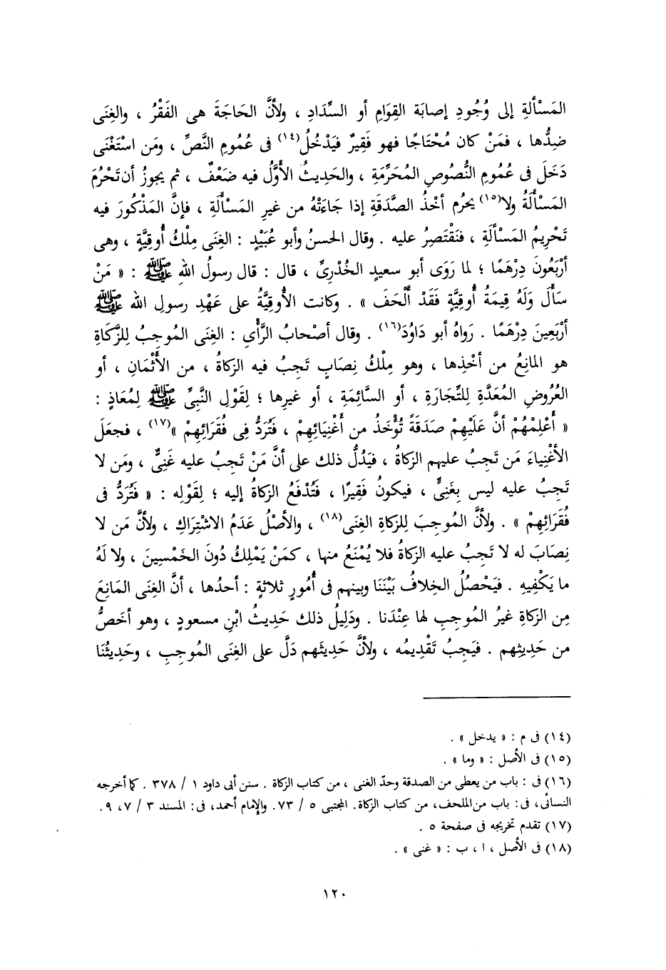 المَسْألةِ إلى وُجُودِ إصابَة القِوَامِ أو السِّدَادِ، ولأنَّ الحَاجَةَ هي الفَقْرُ، والغِنَى ضِدُّها، فمَنْ كان مُحْتَاجًا فهو فَقِيرٌ فيَدْخُلُ (١٤) في عُمُومِ النَّصِّ، ومَن اسْتَغْنَى دَخَلَ في عُمُومِ النُّصُوصِ المُحَرِّمَةِ، والحَدِيثُ الأوَّلُ فيه ضَعْفٌ، ثم يجوزُ أن تَحْرُمَ المَسْأَلَةُ ولا (١٥) يحرُم أخْذُ الصَّدَقَةِ إذا جَاءَتْهُ من غيرِ المَسْأَلَةِ، فإنَّ المَذْكُورَ فيه تَحْرِيمُ المَسْألَةِ، فنَقْتَصِرُ عليه. وقال الحسنُ وأبو عُبَيْدٍ: الغِنَى مِلْكُ أُوقِيَّةٍ، وهي أرْبَعُونَ دِرْهَمًا؛ لما رَوَى أبو سعيدٍ الخُدْرِيِّ، قال: قال رسولُ اللهِ -صَلَّى اللهُ عَلَيْهِ وَسَلَّمَ-: "مَنْ سَأَلَ وَلَهُ قِيمَةُ أُوقِيَّةٍ فَقَدْ أَلْحَفَ". وكانت الأُوقِيَّةُ على عَهْدِ رسولِ اللَّه -صَلَّى اللهُ عَلَيْهِ وَسَلَّمَ- أرْبَعِينَ دِرْهَمًا. رَواهُ أبو دَاوُدَ (١٦). وقال أصْحابُ الرَّأْيِ: الغِنَى المُوجبُ لِلزَّكَاةِ هو المانِعُ من أخْذِها، وهو مِلْكُ نِصَابٍ تَجِبُ فيه الزكاةُ، من الأَثْمَانِ، أو العُرُوضِ المُعَدَّةِ لِلتِّجَارَةِ، أو السَّائِمَةِ، أو غيرِها؛ لِقَوْلِ النَّبِيِّ -صَلَّى اللهُ عَلَيْهِ وَسَلَّمَ- لِمُعَاذٍ: "أعْلِمْهُمْ أنَّ عَلَيْهِمْ صَدَقَةً تُؤخَذُ من أَغْنِيَائِهِمْ، فتُرَدُّ فِي فُقَرَائِهِمْ" (١٧)، فجعَلَ الأغْنِياءَ مَن تَجِبُ عليهم الزكاةُ، فيَدُلُّ ذلك على أنَّ مَنْ تَجِبُ عليه غَنِيٌّ، ومَن لا تَجِبُ عليه ليس بِغَنِيٍّ، فيكونُ فَقِيرًا، فَتُدْفَعُ الزكاةُ إليه؛ لِقَوْلِه: "فَتُرَدُّ في فُقَرَائِهِمْ". ولأنَّ المُوجِبَ لِلزكاةِ الغِنَى (١٨)، والأصْلُ عَدَمُ الاشْتِرَاكِ، ولأنَّ مَن لا نِصَابَ له لا تَجِبُ عليه الزكاةُ فلا يُمْنَعُ منها، كمَنْ يَمْلِكُ دُونَ الخَمْسِينَ، ولا لَهُ ما يَكْفِيهِ. فيَحْصُلُ الخِلافُ بَيْنَنَا وبينهم في أُمُورٍ ثلاثةٍ: أحدُها، أنَّ الغِنَى المَانِعَ مِن الزكاةِ غيرُ المُوجِبِ لها عِنْدَنا. ودَلِيلُ ذلك حَدِيثُ ابْنِ مسعودٍ، وهو أخَصُّ من حَدِيثِهم. فيَجِبُ تَقْدِيمُه، ولأنَّ حَدِيثَهم دَلَّ على الغِنَى المُوجِبِ، وحَدِيثُنَا