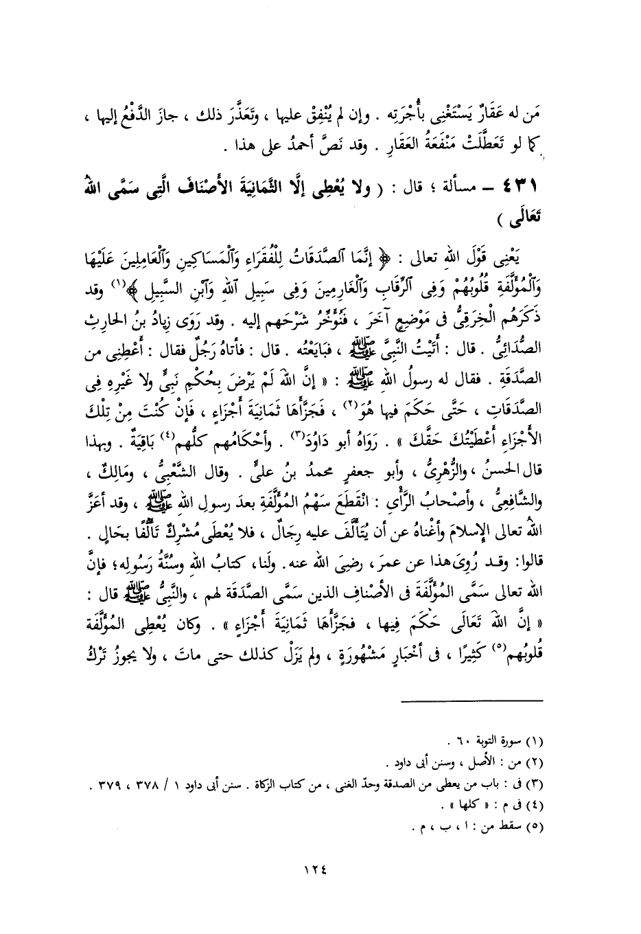 يَعْنِي قَوْلَ اللهِ تعالى: {إِنَّمَا الصَّدَقَاتُ لِلْفُقَرَاءِ وَالْمَسَاكِينِ وَالْعَامِلِينَ عَلَيْهَا وَالْمُؤَلَّفَةِ قُلُوبُهُمْ وَفِي الرِّقَابِ وَالْغَارِمِينَ وَفِي سَبِيلِ اللَّهِ وَابْنِ السَّبِيلِ} (١) وقد ذَكَرَهُم الْخِرَقِيُّ في مَوْضِعٍ آخَرَ، فَنُؤَخِّرُ شَرْحَهم إليه. وقد رَوَى زِيادُ بنُ الحارِثِ الصُّدَائِيُّ. قال: أتَيْتُ النَّبِيَّ -صَلَّى اللهُ عَلَيْهِ وَسَلَّمَ-، فبَايَعْتُه. قال: فأتاهُ رَجُلٌ فقال: أعْطِنِي من الصَّدَقَةِ. فقال له رسولُ اللهِ -صَلَّى اللهُ عَلَيْهِ وَسَلَّمَ-: "إنَّ اللهَ لَمْ يَرْضَ بِحُكْمِ نَبِيٍّ ولا غَيْرِهِ فِي الصَّدَقَاتِ، حَتَّى حَكَمَ فيها هُوَ (٢)، فَجَزَّأَهَا ثَمَانِيَةَ أجْزَاءٍ، فَإنْ كُنْتَ مِنْ تِلْكَ الأجْزَاءِ أعْطَيْتُكَ حَقَّكَ". رَوَاهُ أبو دَاوُدُ (٣). وأحْكَامُهم كلُّهم (٤) بَاقِيَةٌ. وبهذا قال الحسنُ، والزُّهْرِيُّ، وأبو جعفرٍ محمدُ بنُ عليٍّ. وقال الشَّعْبِيُّ، ومَالِكٌ، والشَّافِعِيُّ، وأصْحابُ الرَّأْيِ: انْقَطَعَ سَهْمُ المُؤَلَّفَةِ بعدَ رسولِ اللهِ -صَلَّى اللهُ عَلَيْهِ وَسَلَّمَ-، وقد أعَزَّ اللَّه تعالى الإسلامَ وأغْناهُ عن أن يُتَأَلَّفَ عليه رِجَالٌ، فلا يُعْطَى مُشْرِكٌ تَأَلُّفًا بحَالٍ. قالوا: وقد رُوِيَ هذا عن عمرَ، رضِيَ اللَّه عنه. ولَنا، كتابُ اللهِ وسُنَّةُ رَسُولِه؛ فإنَّ اللَّه تعالى سَمَّى المُؤَلَّفَةَ في الأصْنافِ الذين سَمَّى الصَّدَقَة لهم، والنَّبِيُّ -صَلَّى اللهُ عَلَيْهِ وَسَلَّمَ- قال: "إنَّ اللهَ تَعَالَى حَكَمَ فِيها، فجَزَّأَهَا ثَمَانِيَةَ أجْزَاءٍ". وكان يُعْطِي المُؤَلَّفَة قُلوبُهم (٥) كَثِيرًا، في أخْبَارٍ مَشْهُورَةٍ، ولم يَزَلْ كذلك حتى ماتَ، ولا يجوزُ تَرْكُ