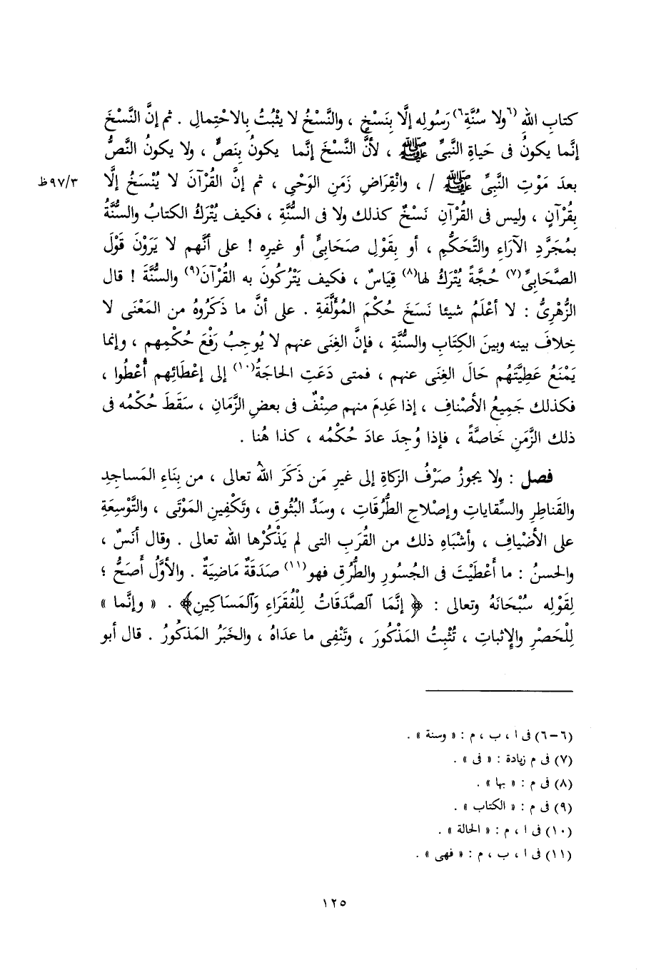 كتابِ اللهِ [ولا سُنَّةِ] (٦) رَسُولِه إلَّا بِنَسْخٍ، والنَّسْخُ لا يثْبُتُ بِالاحْتِمالِ. ثم إنَّ النَّسْخَ إنَّما يكونُ في حَياةِ النَّبيِّ -صَلَّى اللهُ عَلَيْهِ وَسَلَّمَ-، لأنَّ النَّسْخَ إنَّما يكونُ بِنَصٍّ، ولا يكونُ النَّصُّ بعدَ مَوْتِ النَّبِيِّ -صَلَّى اللهُ عَلَيْهِ وَسَلَّمَ-، وانْقِرَاضِ زَمَنِ الوَحْي، ثم إنَّ القُرآنَ لا يُنْسَخُ إلَّا بِقُرْآنٍ، وليس في القُرْآنِ نَسْخٌ كذلك ولا في السُّنَّةِ، فكيف يُتْرَكُ الكتابُ والسُّنَّةُ بمُجَرَّدِ الآرَاءِ والتَّحَكُّمِ، أو بِقَوْلِ صَحَابِيٍّ أو غيرِه! على أَنَّهم لا يَرَوْنَ قَوْلَ الصَّحَابِيِّ (٧) حُجَّةً يُتْرَكُ لها (٨) قِيَاسٌ، فكيف يَتْرُكُونَ به القُرْآنَ (٩) والسُّنَّةَ! قال الزُّهْرِيُّ: لا أعْلَمُ شيئًا نَسَخَ حُكْمَ المُؤَلَّفَةِ. على أنَّ ما ذَكَرُوهُ من المَعْنَى لا خِلافَ بينه وبينَ الكِتَابِ والسُّنَّةِ، فإنَّ الغِنَى عنهم لا يُوجِبُ رَفْعَ حُكْمِهم، وإنما يَمْنَعُ عَطِيَّتَهُم حَالَ الغِنَى عنهم، فمتى دَعَتِ الحاجَةُ (١٠) إلى إعْطَائِهم أُعْطُوا، فكذلك جَمِيعُ الأصْنافِ، إذا عَدِمَ منهم صِنْفٌ في بعضِ الزَّمَانِ، سَقَطَ حُكْمُه في ذلك الزَّمَنِ خَاصَّةً، فإذا وُجِدَ عادَ حُكْمُه، كذا هُنا.