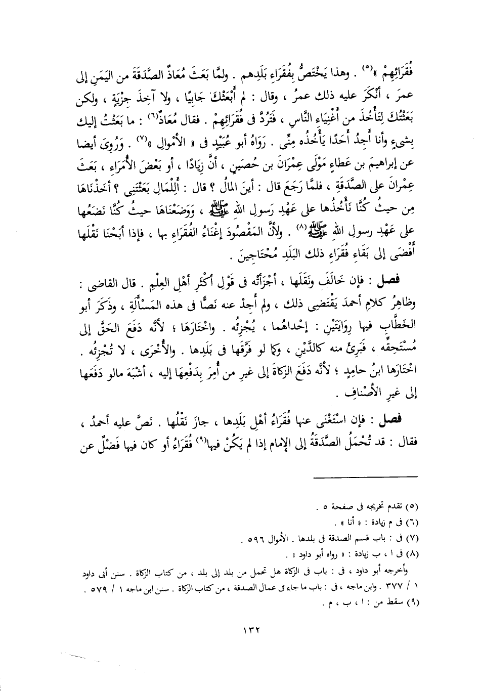 فُقَرَائِهِمْ" (٥). وهذا يَخْتَصُّ بِفُقَرَاءِ بَلَدِهم. ولمَّا بَعَثَ مُعَاذٌ الصَّدَقَةَ من اليَمَنِ إلى عمرَ، أنْكَرَ عليه ذلك عمرُ، وقال: لم أَبْعَثْكَ جَابِيًا، ولا آخِذَ جِزْيَةٍ، ولكن بَعَثْتُكَ لِتَأْخُذَ من أَغْنِيَاءِ النَّاسِ، فَتَرُدَّ في فُقَرَائِهِمْ. فقال مُعَاذٌ (٦): ما بَعَثْتُ إليك بِشىءٍ وأنا أَجِدُ أَحَدًا يَأْخُذُه مِنِّي. رَوَاهُ أبو عُبَيْدٍ في "الأمْوالِ" (٧). وَرُوِيَ أيضًا عن إبراهيمَ بن عَطاءٍ مَوْلَى عِمْرَانَ بن حُصَينٍ، أنَّ زِيَادًا، أو بَعْضَ الأُمَرَاءِ، بَعَثَ عِمْرانَ على الصَّدَقَةِ، فلمَّا رَجَعَ قال: أينَ المالُ؟ قال: ألِلْمَالِ بَعَثْتَنِى؟ أخَذْنَاهَا مِن حيثُ كُنَّا نَأْخُذُها على عَهْدِ رَسولِ اللهِ -صَلَّى اللهُ عَلَيْهِ وَسَلَّمَ-، وَوَضَعْنَاهَا حيثُ كُنَّا نَضَعُها على عَهْدِ رسولِ اللهِ -صَلَّى اللهُ عَلَيْهِ وَسَلَّمَ- (٨). ولأنَّ المَقْصُودَ إغْنَاءُ الفُقَرَاءِ بها، فإذا أبَحْنَا نَقْلَها أَفْضَى إلى بَقَاءِ فُقَرَاءِ ذلك البَلَدِ مُحْتَاجِينَ.