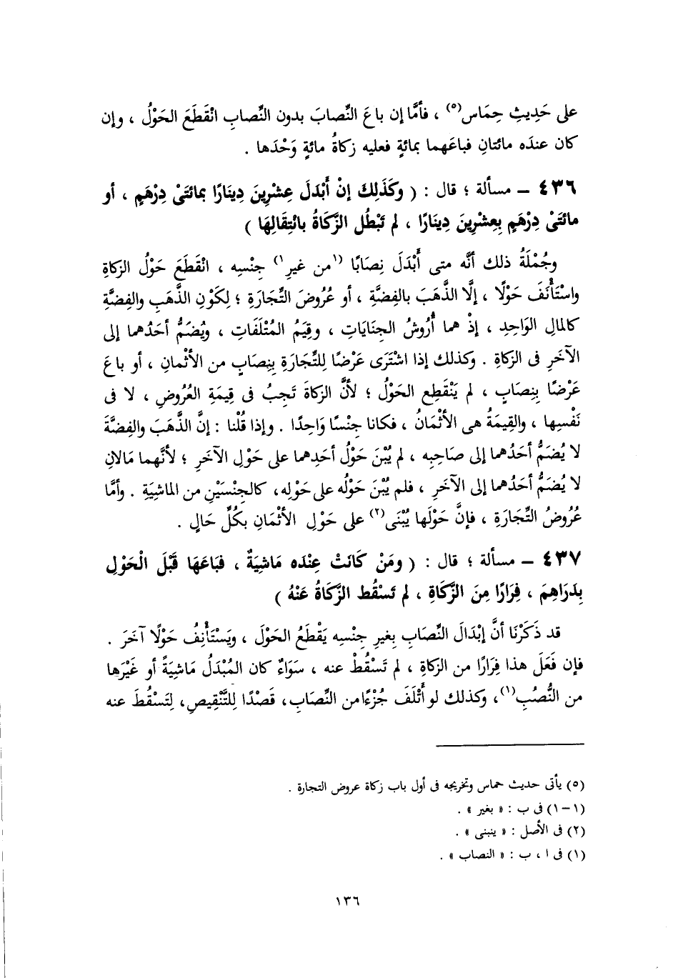 على حَدِيثِ حِمَاس (٥)، فأمَّا إن باعَ النِّصابَ بدون النِّصابِ انْقَطَعَ الحَوْلُ، وإن كان عندَه مائتانِ فباعَهما بمائةٍ فعليه زكاةُ مائةٍ وَحْدَها.