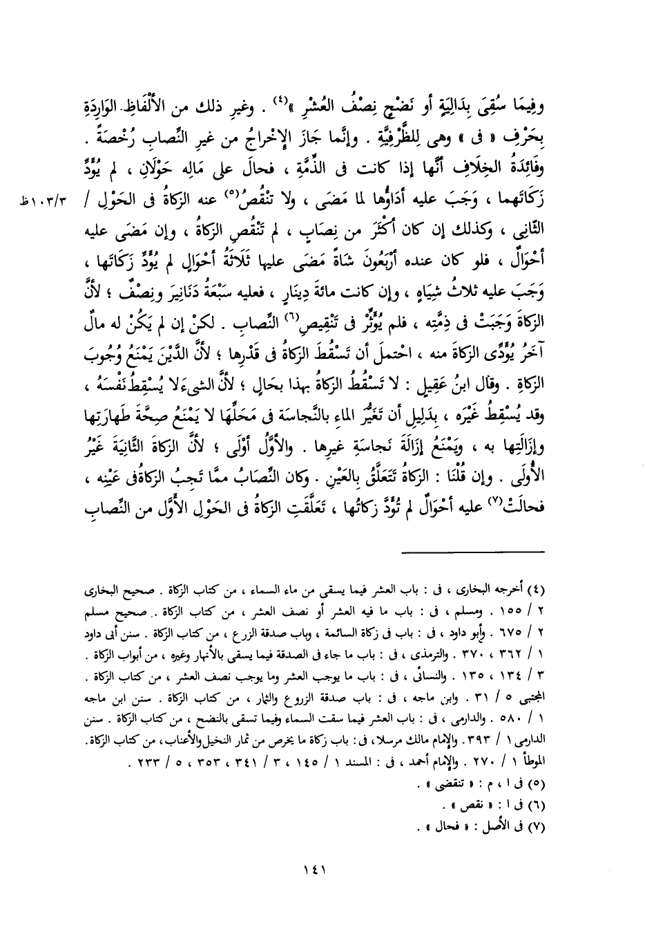 (٤) أخرجه البخاري، في: باب العشر فيما يسقى من ماء السماء، من كتاب الزكاة. صحيح البخاري ٢/ ١٥٥. ومسلم، في: باب ما فيه العشر أو نصف العشر، من كتاب الزكاة. صحيح مسلم ٢/ ٦٧٥. وأبو داود، في: باب في زكاة السائمة، وباب صدقة الزرع، من كتاب الزكاة. سنن أبي داود ١/ ٣٦٢، ٣٧٠. والترمذي، في: باب ما جاء في الصدقة فيما يسقى بالأنهار وغيره، من أبواب الزكاة. ٣/ ١٣٤، ١٣٥. والنسائي، في: باب ما يوجب العشر وما يوجب نصف العشر، من كتاب الزكاة. المجتبى ٥/ ٣١. وابن ماجه، في: باب صدقة الزرع والثمار، من كتاب الزكاة. سنن ابن ماجه ١/ ٥٨٠. والدارمي، في: باب العشر فيما سقت السماء وفيما تسقى بالنضح، من كتاب الزكاة. سنن الدارمي ١/ ٣٩٣. والإمام مالك مرسلا، في: باب زكاة ما يخرص من ثمار النخيل والأعناب، من كتاب الزكاة. الموطأ ١/ ٢٧٠. والإمام أحمد، في: المسند ١/ ١٤٥، ٣/ ٣٤١، ٣٥٣، ٥/ ٢٣٣.