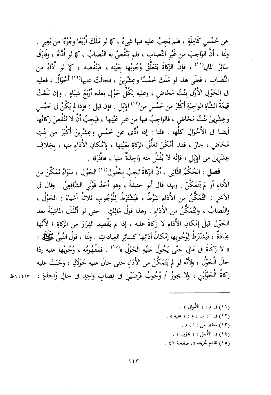 فصل: الحُكْمُ الثَّانِي، أنَّ الزكاةَ تَجِبُ بِحُلُولِ (١٤) الحَوْلِ، سَوَاءٌ تَمَكَّنَ من الأداءِ أو لم يَتَمَكَّنْ. وبهذا قال أبو حنيفةَ، وهو أحَدُ قَوْلَي الشَّافِعِيِّ. وقال في الآخَرِ: التَّمَكُّنُ من الأدَاءِ شَرْطٌ، فيُشْتَرَطُ لِلْوُجُوبِ ثلاثةُ أشياءَ: الحَوْلُ، والنِّصابُ، والتَّمَكُّنُ من الأدَاءِ. وهذا قولُ مَالِكٍ. حتى لو أتْلَفَ الماشِيَةَ بعد الحَوْلِ قبلَ إمْكانِ الأدَاءِ لا زكاةَ عليه، إذا لم يَقْصِد الفِرَارَ من الزَّكاةِ؛ لأنَّها عِبَادَةٌ، فيُشْتَرَطُ لِوُجُوبِها إمْكانُ أدَائِها كسائِرِ العِباداتِ. ولَنا، قولُ النَّبِيِّ -صَلَّى اللهُ عَلَيْهِ وَسَلَّمَ-: "لا زَكَاةَ في مَالٍ حَتَّى يَحُولَ عَلَيْهِ الْحَوْلُ" (١٥). فمَفْهُومُه، وُجُوبُها عليه إذا حالَ الْحَوْلُ، ولأنَّه لو لم يَتَمَكَّنْ من الأدَاءِ حتى حالَ عليه حَوْلَانِ، وَجَبَتْ عليه زكاةُ الْحَوْلَيْنِ، ولا يجوزُ وُجُوبُ فَرْضَيْنِ في نِصابٍ واحِدٍ في حالٍ وَاحِدَةٍ،