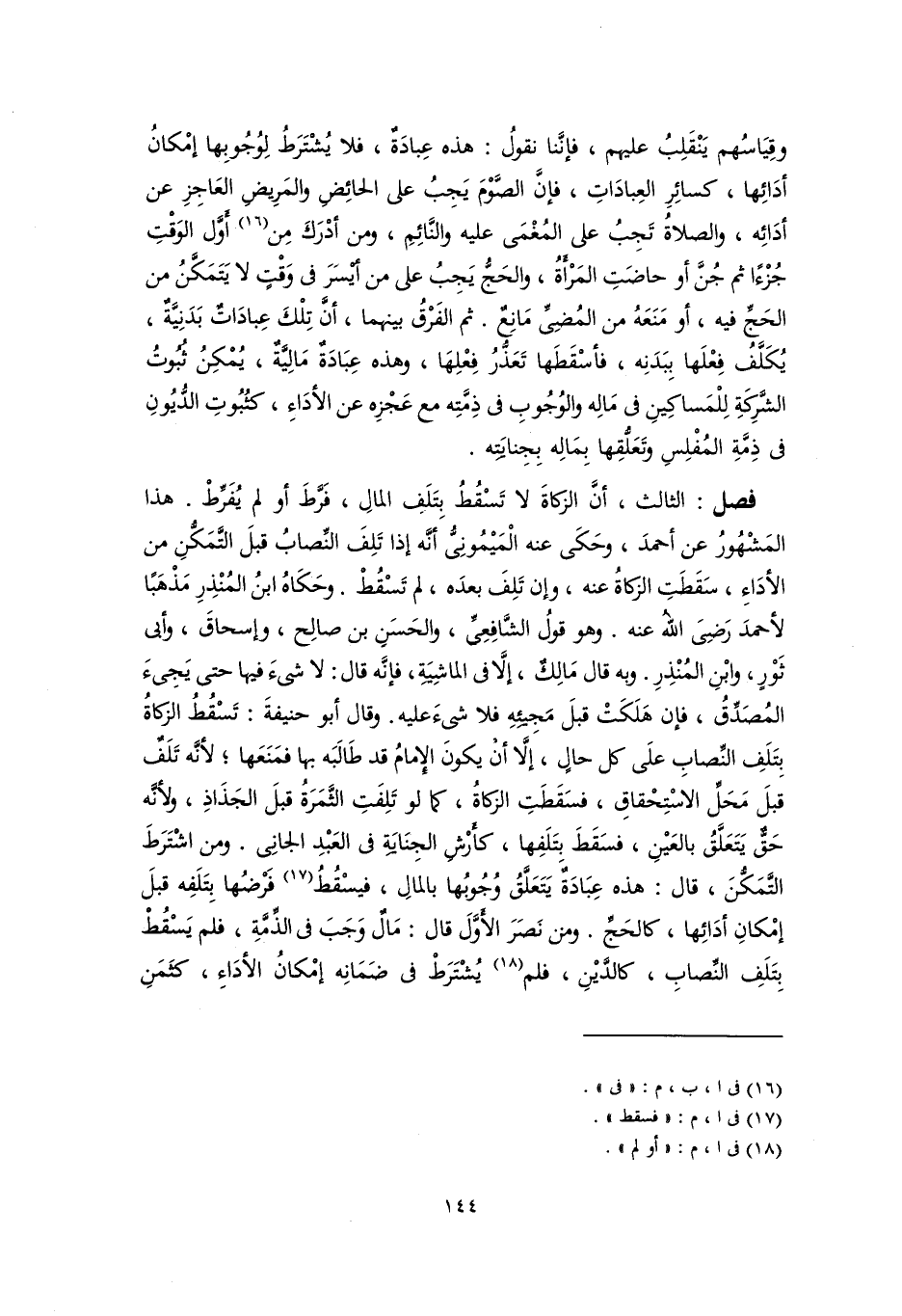 فصل: الثالث، أنَّ الزكاةَ لا تَسْقُطُ بتَلَفِ المالِ، فَرَّطَ أو لم يُفَرِّطْ. هذا المَشْهُورُ عن أحمدَ، وحَكَى عنه الْمَيْمُونِيُّ أنَّه إذا تَلِفَ النِّصابُ قبلَ التَّمَكُّنِ من الأدَاءِ، سَقَطَتِ الزكاةُ عنه، وإن تَلِفَ بعدَه، لم تَسْقُطْ. وحَكَاهُ ابنُ المُنْذِرِ مَذْهَبًا لأحمدَ رَضِيَ اللهُ عنه. وهو قولُ الشَّافِعِيِّ، والحَسَنِ بن صالِح، وإسحاقَ، وأبي ثَوْرٍ، وابْنِ المُنْذِرِ. وبه قال مَالِكٌ، إلَّا في الماشِيَةِ، فإنَّه قال: لا شىءَ فيها حتى يَجِىءَ المُصَدِّقُ، فإن هَلَكَتْ قبلَ مَجِيئِهِ فلا شىءَ عليه. وقال أبو حنيفةَ: تَسْقُطُ الزكاةُ بِتَلَفِ النِّصابِ علَى كل حالٍ، إلَّا أن يكونَ الإمامُ قد طَالَبَه بها فمَنَعَها؛ لأنَّه تَلَف قبلَ مَحَلِّ الاسْتِحْقاقِ، فسَقَطَتِ الزكاةُ، كما لو تَلِفَتِ الثَّمَرَةُ قبلَ الجَذَاذِ، ولأنَّه حَقٌّ يَتَعَلَّقُ بالعَيْنِ، فسَقَطَ بتَلَفِها، كأَرْشِ الجِنَايَةِ في العَبْدِ الجانِي. ومن اشْتَرَطَ التَّمَكُّنَ، قال: هذه عِبَادَةٌ يَتَعَلَّقُ وُجُوبُها بالمالِ، فيسْقُطُ (١٧) فَرْضُها بِتَلَفِه قبلَ إمْكانِ أدَائِها، كالحَجِّ. ومن نَصَرَ الأوَّلَ قال: مَالٌ وَجَبَ في الذِّمَّةِ، فلم يَسْقُطْ بِتَلَفِ النِّصابِ، كالدَّيْنِ، فلم (١٨) يُشْتَرَطْ في ضَمَانِه إمْكانُ الأدَاءِ، كثَمَنِ
