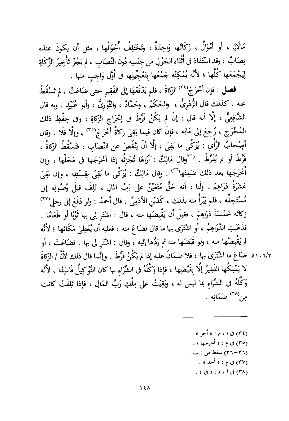 فصل: فإن أخْرَجَ (٣٤) الزكاةَ، فلم يَدْفَعْهَا إلى الفَقِيرِ حتى ضَاعَتْ، لم تَسْقُطْ عنه. كذلك قال الزُّهْرِيُّ، والحَكَمُ، وحَمَّادٌ، والثَّوْرِيُّ، وأبو عُبَيدٍ. وبه قال الشَّافِعِيُّ، إلَّا أنه قال: إنْ لم يَكُنْ فَرَّطَ في إخْرَاجِ الزكاةِ، وفي حِفْظِ ذلك المُخْرَجِ، رُجِعَ إلى مَالِه، فإنْ كان فيما بَقِيَ زكاةٌ أخْرَجَ (٣٥)، وإلَّا فلَا. وقال أصْحابُ الرَّأْيِ: يُزَكِّي ما بَقِيَ، إلَّا أنْ يَنْقُصَ عن النِّصَابِ، فتَسْقُطُ الزكاةُ، فَرَّطَ أو لم يُفَرِّطْ. [وقال مَالِكٌ: أرَاهَا تُجْزِئُه إذا أخْرَجَها في مَحَلِّها، وإن أخْرَجَها بعد ذلك ضَمِنَها] (٣٦). وقال مَالِكٌ: يُزَكِّي ما بَقِيَ بِقِسْطِه، وإن بَقِيَ عَشَرَةُ دَرَاهِمَ. ولَنا، أنه حَقٌّ مُتَعَيِّنٌ على رَبِّ المالِ، تَلِفَ قبلَ وُصُولِه إلى مُسْتَحِقِّه، فلم يَبْرَأْ منه بذلك، كَدَيْنِ الآدَمِيِّ. قال أحمدُ: ولو دَفَعَ إلى رجلٍ (٣٧) زكاتَه خَمْسَةَ دَرَاهِمَ، فقبلَ أن يَقْبِضَها منه، قال: اشْتَرِ لِى بها ثَوْبًا أو طَعَامًا. فذَهَبَتِ الدَّرَاهِمُ، أو اشْتَرَى بها ما قال فضَاعَ منه، فعليه أن يُعْطِىَ مَكَانَها؛ لأنَّه لم يَقْبِضْها منه، ولو قَبَضَها منه ثم رَدَّها إليه، وقال: اشْتَرِ لي بها. فضَاعَتْ، أو ضَاعَ ما اشْتَرَى بها، فلا ضَمَانَ عليه إذا لم يَكُنْ فَرَّطَ. وإنَّما قال ذلك لأنَّ الزكاةَ لا يَمْلِكُها الفَقِيرُ إلَّا بِقَبْضِها، فإذا وَكَّلَهُ في الشِّرَاءِ بها كان التَّوْكِيلُ فَاسِدًا، لأنَّه وَكَّلَهُ في الشِّرَاءِ بما ليس له، وبَقِيَتْ على مِلْكِ رَبِّ المَالِ، فإذا تَلِفَتْ كانت مِن (٣٨) ضَمَانِه.