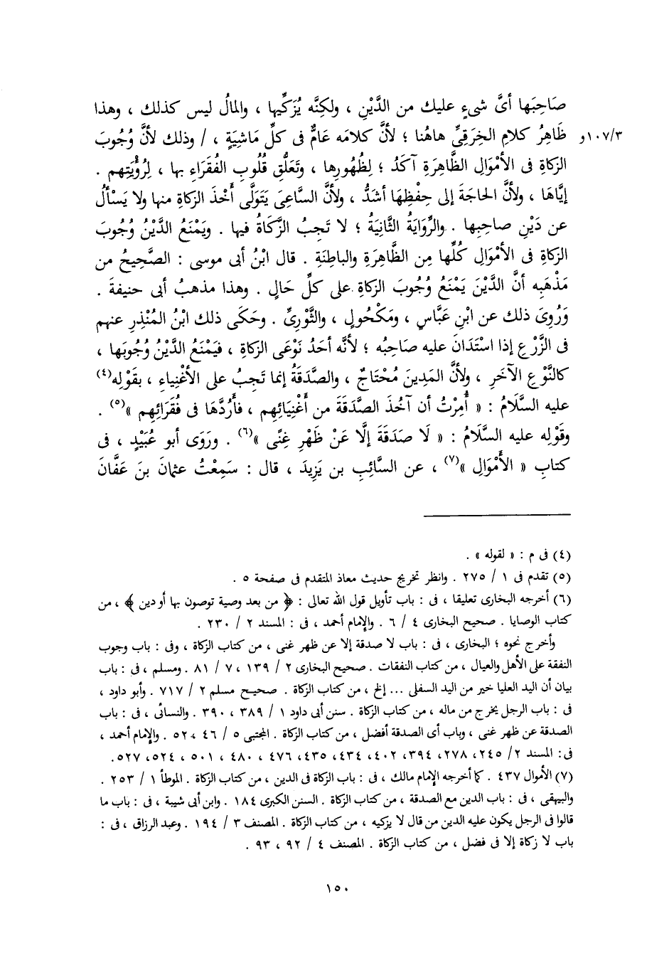 (٧) الأموال ٤٣٧. كما أخرجه الإمام مالك، في: باب الزكاة في الدين، من كتاب الزكاة. الموطأ ١/ ٢٥٣. والبيهقي، في: باب الدين مع الصدقة، من كتاب الزكاة. السنن الكبرى ١٨٤. وابن أبي شيبة، في: باب ما قالوا في الرجل يكون عليه الدين من قال لا يزكيه، من كتاب الزكاة. المصنف ٣/ ١٩٤. وعبد الرزاق، في: باب لا زكاة إلا في فصل، من كتاب الزكاة. المصنف ٤/ ٩٢، ٩٣.