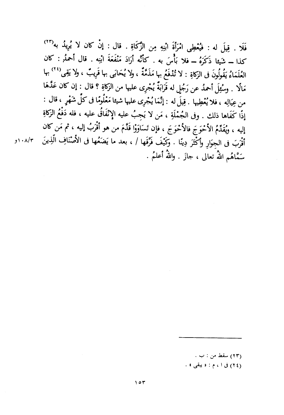 فَلَا. قِيلَ له: فيُعْطِي امْرَأةَ ابْنِهِ مِن الزكاةِ. قال: إنْ كان لا يُرِيدُ به (٢٣) كذا -شَيئا ذَكَرَهُ- فلا بَأْسَ به. كأَنَّه أَرَادَ مَنْفَعَةَ ابْنِه. قال أحمدُ: كان العُلَمَاءُ يَقُولُونَ في الزكاةِ: لا تُدْفَعُ بها مَذَمَّةٌ، ولا يُحَابَى بها قَرِيبٌ، ولا يَقِي (٢٤) بها مَالًا. وسُئِلَ أحمدُ عن رَجُلٍ له قَرَابَةٌ يُجْرِي عليها من الزكاةِ؟ قال: إن كان عَدَّهَا من عِيَالِه، فلا يُعْطِيها. قِيلَ له: إنَّمَا يُجْرِي عليها شيئا مَعْلُومًا في كلِّ شَهْرٍ، قال: إذًا كَفَاها ذلك. وفي الجُمْلَةِ، مَن لا يَجِبُ عليه الإنْفَاقُ عليه، فله دَفْعُ الزكاةِ إليه، ويُقَدِّمُ الأحْوَجَ فالأحْوَجَ، فإن تَسَاوَوْا قَدَّمَ من هو أقْرَبُ إليه، ثم مَن كان أقْرَبَ في الجِوَارِ وأَكْثَرَ دِينًا. وكيْفَ فَرَّقَها، بعد ما يَضَعُها في الأصْنَافِ الَّذِينَ سَمَّاهُم اللهُ تعالى، جازَ. واللهُ أعلمُ.