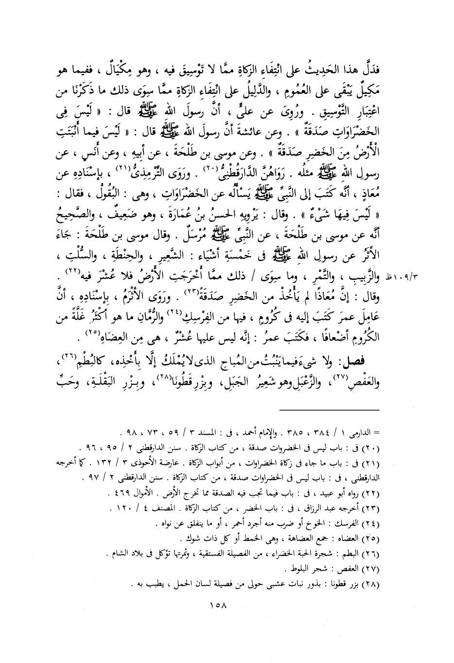 فدَلَّ هذا الحَدِيثُ على انْتِفَاءِ الزكاةِ ممَّا لا تَوْسِيقَ فيه، وهو مِكْيَالٌ، ففيما هو مَكِيلٌ يَبْقَى على العُمُومِ، والدَّلِيلُ على انْتِفَاءِ الزكاةِ ممَّا سِوَى ذلك ما ذَكَرْنَا من اعْتِبَارِ التَّوْسِيقِ. ورُوِىَ عن عليٍّ، أنَّ رسولَ اللهِ -صَلَّى اللهُ عَلَيْهِ وَسَلَّمَ- قال: "لَيْسَ فِي الخَضْرَاوَاتِ صَدَقَةٌ". وعن عائشةَ أنَّ رسولَ اللهِ -صَلَّى اللهُ عَلَيْهِ وَسَلَّمَ- قال: "لَيْسَ فيما أنبَتَتِ الْأرْضُ مِنَ الخَضِرِ صَدَقَةٌ". وعن موسى بن طَلْحَةَ، عن أبِيهِ، وعن أنَسٍ، عن رسولِ اللهِ -صَلَّى اللهُ عَلَيْهِ وَسَلَّمَ- مثلُه. رَوَاهُنَّ الدَّارَقُطْنِيُّ (٢٠). ورَوَى التِّرْمِذِيُّ (٢١)، بإسْنَادِهِ عن مُعَاذٍ، أنَّه كَتَبَ إلى النَّبِيِّ -صَلَّى اللهُ عَلَيْهِ وَسَلَّمَ- يَسْأَلُه عن الخَضْرَاوَاتِ، وهي: البُقُول، فقال: "لَيْسَ فِيهَا شَىْءٌ". وقال: يَرْوِيهِ الحسنُ بنُ عُمَارَةَ، وهو ضَعِيفٌ، والصَّحِيحُ أنَّه عن موسى بن طَلْحَةَ، عن النَّبِيِّ -صَلَّى اللهُ عَلَيْهِ وَسَلَّمَ- مُرْسَلٌ. وقال موسى بن طَلْحَةَ: جَاءَ الأثَرُ عن رسولِ اللهِ -صَلَّى اللهُ عَلَيْهِ وَسَلَّمَ- في خَمْسَةِ أشْيَاء: الشَّعِيرِ، والحِنْطَةِ، والسُّلْتِ، والزَّبِيبِ، والتَّمْرِ، وما سِوَى ذلك ممَّا أخْرَجَتِ الأرْضُ فلا عُشْرَ فيه (٢٢). وقال: إنَّ مُعَاذًا لم يَأخُذْ من الخَضِرِ صَدَقَةً (٢٣). ورَوَى الأثْرَمُ، بإسْنَادِهِ، أنَّ عَامِلَ عمرَ كَتَبَ إليه في كُرُومٍ، فيها من الفِرْسِكِ (٢٤) والرُّمَّانِ ما هوَ أكْثَرُ غَلَّةً من الكُرُومِ أضْعافًا، فكَتَبَ عمرُ: إنَّه ليس عليها عُشْرٌ، هي مِن العِضَاهِ (٢٥).