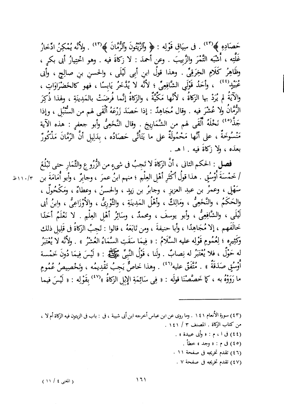 حَصَادِهِ} (٤٣). في سِيَاقِ قَوْلِه: {وَالزَّيْتُونَ وَالرُّمَّانَ} (٤٣). ولأنَّه يُمْكِنُ ادِّخَارُ غَلَّتِه، أشْبَه التَّمْرَ والزَّبِيبَ. وعن أحمدَ: لا زكاةَ فيه. وهو اخْتِيارُ أبي بكرٍ، وظَاهِرُ كَلَامِ الخِرَقِيِّ. وهذا قولُ ابنِ أبِى لَيْلَى، والحسنِ بنِ صالِحٍ، وأبي عُبَيْدٍ (٤٤)، وأحَدُ قَوْلَي الشَّافِعِيِّ؛ لأنَّه لا يُدَّخَرُ يَابِسًا، فهو كالخَضْرَاوَاتِ، والآيَةُ لم يُرَدْ بها الزكاةُ، لأنَّها مَكِّيَّةٌ، والزكاةُ إنَّما فُرِضَتْ بالمَدِينَةِ، ولهذا ذُكِرَ الرُّمَّانُ ولا عُشْرَ فيه. وقال مُجَاهِدٌ: إذا حَصَدَ زَرْعَهُ ألْقَى لهم من السُّنْبُلِ، وإذا جَذَّ (٤٥) نَخْلَهُ أَلْقَى لهم من الشَّمَارِيخِ. وقال النَّخَعِيُّ وأبو جعفرٍ: هذه الآية مَنْسُوخَةٌ، على أنَّها مَحْمُولَةٌ على ما يَتَأَتَّى حَصَادُه، بِدَلِيلِ أنَّ الرّمَّانَ مَذْكُورٌ بعدَه، ولا زكاةَ فيه. اهـ.