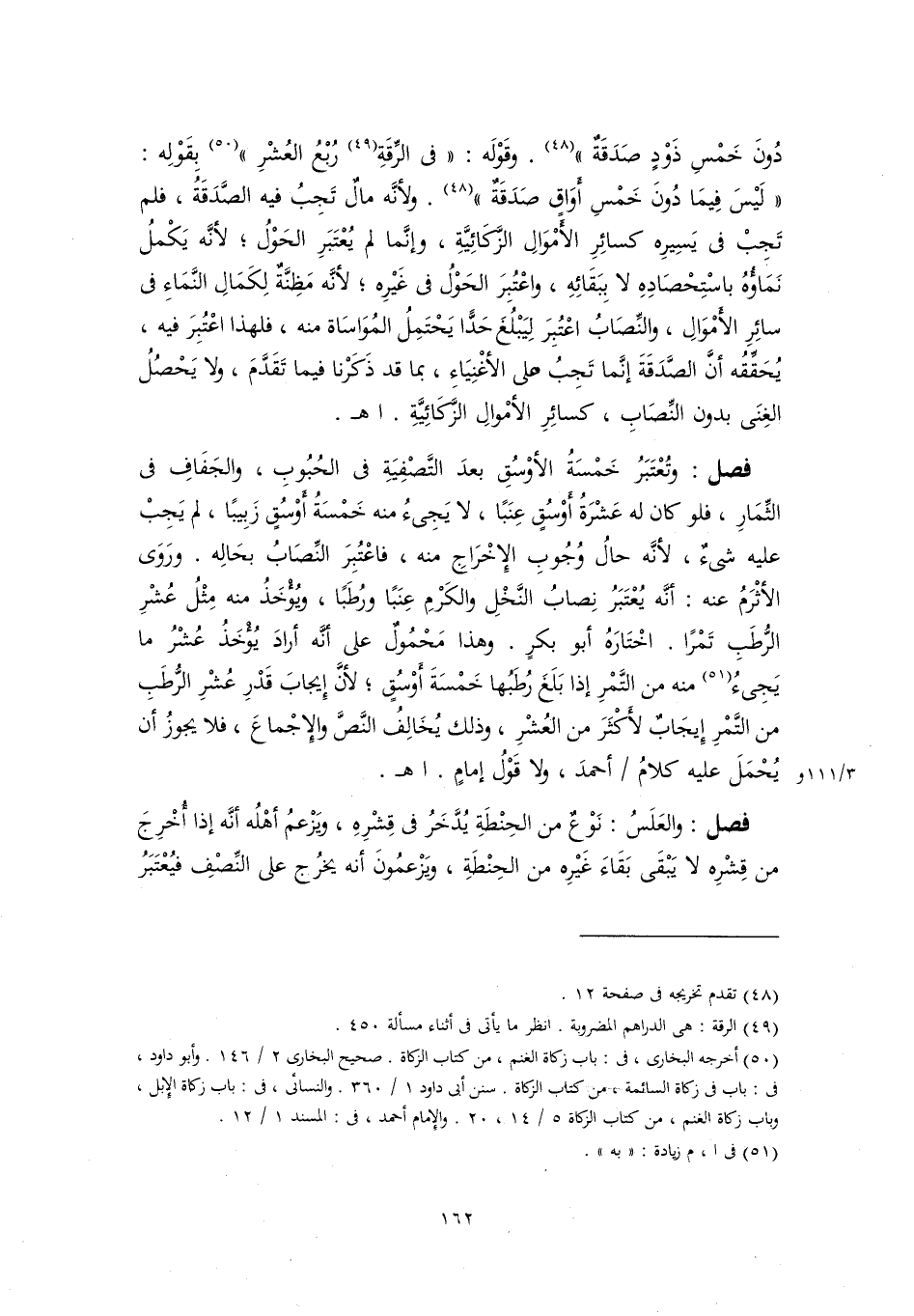 دُونَ خَمْسِ ذَوْدٍ صَدَقَةٌ" (٤٨). وقَوْلَه: "في الرِّقَةِ (٤٩) رُبْعُ العُشْرِ" (٥٠) بِقَوْلِه: "لَيْسَ فِيمَا دُونَ خَمْسِ أَوَاقٍ صَدَقَةٌ" (٤٨). ولأنَّه مالٌ تَجِبُ فيه الصَّدَقَةُ، فلم تَجِبْ في يَسِيرِه كسائِرِ الأمْوَالِ الزَّكَائِيَّةِ، وإنَّما لم يُعْتَبَرِ الحَوْلُ؛ لأنَّه يَكْملُ نَمَاؤُهُ باسْتِحْصَادِهِ لا بِبَقَائِهِ، واعْتُبِرَ الحَوْلُ في غَيْرِه؛ لأنَّه مَظِنَّةٌ لِكَمَالِ النَّمَاءِ في سائِرِ الأمْوَالِ، والنِّصَابُ اعْتُبِرَ لِيَبْلُغَ حَدًّا يَحْتَمِلُ المُوَاسَاة منه، فلهذا اعْتُبِرَ فيه، يُحَقِّقُه أنَّ الصَّدَقَةَ إنَّما تَجِبُ على الأغْنِيَاءِ، بما قد ذَكَرْنا فيما تَقَدَّمَ، ولا يَحْصُلُ الغِنَى بدون النِّصَابِ، كسائِرِ الأمْوالِ الزَّكَائِيَّةِ. اهـ.