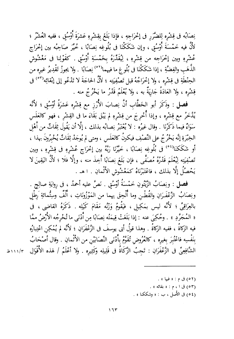 فصل: ونِصَابُ الزَّيْتُونِ خَمْسَةُ أوْسُقٍ. نَصَّ عليه أحمدُ، في رِوايَةِ صالِحٍ. ونِصَابُ الزَّعْفَرَانِ والقُطْنِ وما أُلْحِقَ بهما من المَوْزُونَاتِ، ألفٌ وسِتُّمائةِ رِطْلٍ بالعِرَاقِيِّ؛ لأنَّه ليس بمَكِيلٍ، فيَقُومُ وَزْنُه مَقَامَ كَيْلِه. ذَكَرَهُ القاضي، في "المُجَرَّدِ". وحُكِيَ عنه: إذا بَلَغَتْ قِيمَتُه نِصَابًا مِن أدْنَى ما تُخْرِجُه الأرْضُ ممَّا فيه الزكاةُ، ففيه الزكاةُ. وهذا قولُ أبي يوسفَ في الزَّعْفَرَانِ؛ لأنَّه لم يُمْكِنِ اعْتِبارُه بِنَفْسِه فاعْتُبِرَ بِغيرِه، كالعُرُوض تُقَوَّمُ بِأدْنَى النِّصَابَيْنِ من الأثْمانِ. وقال أصْحَابُ الشَّافِعِيِّ في الزَّعْفَرَانِ: تَجِبُ الزَّكاةُ في قَلِيلِه وكَثِيرِه. ولا أعْلَمُ لهذه الأقْوَالِ