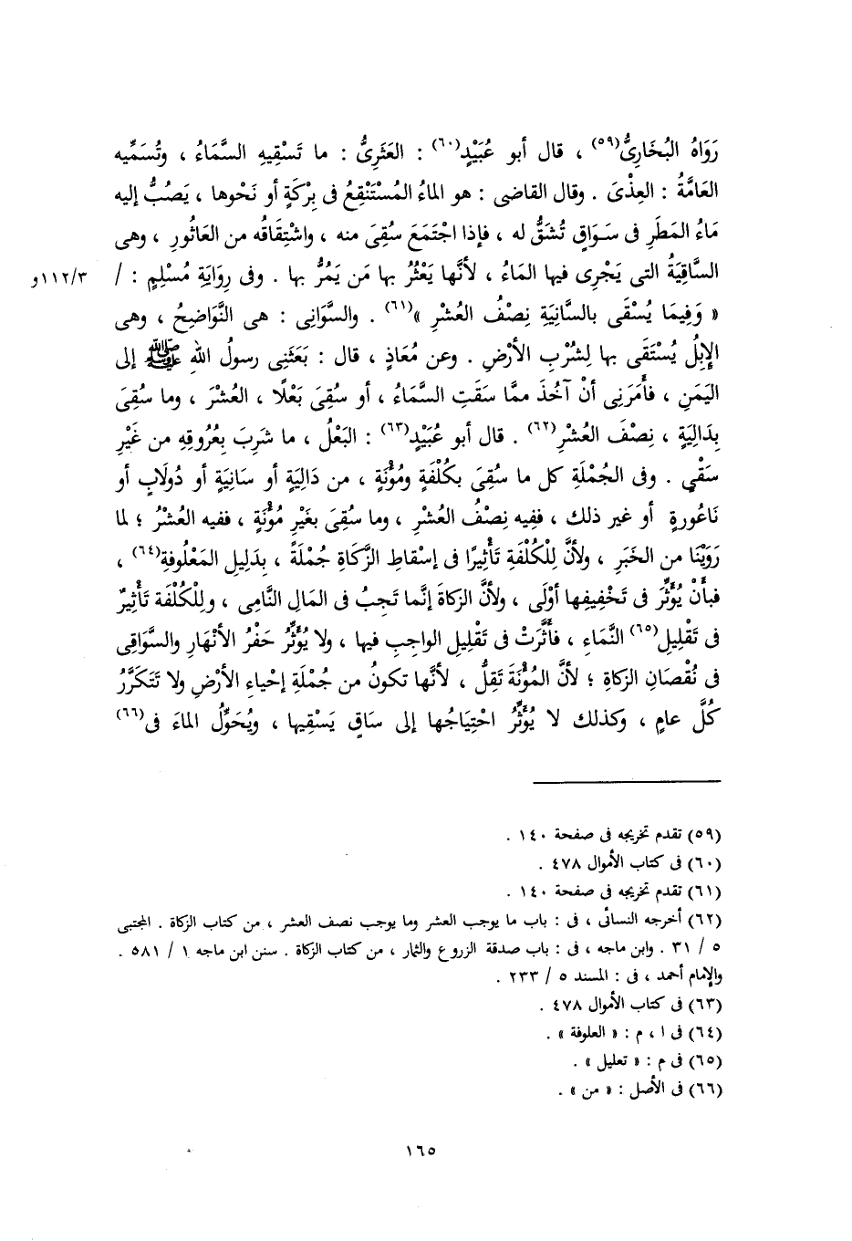 رَوَاهُ البُخَارِيُّ (٥٩)، قال أبو عُبَيْدٍ (٦٠): العَثَرِيُّ: ما تَسْقِيهِ السَّمَاءُ، وتُسَمِّيه العَامَّةُ: العِذْيَ. وقال القاضي: هو الماءُ المُسْتَنْقِعُ في بِرْكَةٍ أو نَحْوها، يَصُبُّ إليه مَاءُ المَطَرِ في سَوَاقٍ تُشَقُّ له، فإذا اجْتَمَعَ سُقِيَ منه، واشْتِقَاقُه من العَاثُورِ، وهي السَّاقِيَةُ التي يَجْرِى فيها المَاءُ، لأنَّها يَعْثُرُ بها مَن يَمُرُّ بها. وفي رِوَايَةِ مُسْلِمٍ: "وَفِيمَا يُسْقَى بالسَّانِيَةِ نِصْفُ العُشْرِ" (٦١). والسَّوَانِي: هي النَّوَاضِحُ، وهي الإِبِلُ يُسْتَقَى بها لِشُرْبِ الأرْضِ. وعن مُعَاذٍ، قال: بَعَثَنِي رسولُ اللهِ -صَلَّى اللهُ عَلَيْهِ وَسَلَّمَ- إلى اليَمَنِ، فأمَرَنِي أنْ آخُذَ ممَّا سَقَتِ السَّمَاءُ، أو سُقِيَ بَعْلًا، العُشْرَ، وما سُقِيَ بِدَالِيَةٍ، نِصْفَ العُشْرِ (٦٢). قال أبو عُبَيْدٍ (٦٣): البَعْلُ، ما شَرِبَ بِعُرُوقِهِ من غَيْرِ سَقْيٍ. وفي الجُمْلَةِ كل ما سُقِيَ بكُلْفَةٍ ومُؤنَةٍ، من دَالِيَةٍ أو سَانِيَةٍ أو دُولَابٍ أو نَاعُورةٍ أو غير ذلك، ففِيه نِصْفُ العُشْرِ، وما سُقِيَ بغَيْرِ مُؤْنَةٍ، ففيه العُشْرُ؛ لما رَوَيْنَا من الخَبَرِ، ولأنَّ لِلْكُلْفَةِ تَأْثِيرًا في إسْقاطِ الزَّكَاةِ جُمْلَةً، بِدَلِيلِ المَعْلُوفةِ (٦٤)، فبأَنْ يُؤَثِّرَ في تَخْفِيفِها أوْلَى، ولأنَّ الزكاةَ إنَّما تَجِبُ في المَالِ النَّامِى، ولِلْكُلْفَة تَأْثِيرٌ في تَقْلِيلِ (٦٥) النَّمَاءِ، فأثَّرَتْ في تَقْلِيلِ الواجِبِ فيها، ولا يُؤَثِّرُ حَفْرُ الأنْهَارِ والسَّوَاقِي في نُقْصَانِ الزكاةِ؛ لأنَّ المُؤْنَةَ تَقِلُّ، لأنَّها تكونُ من جُمْلَةِ إحْياءِ الأرْضِ ولا تَتَكَرَّرُ كُلَّ عامٍ، وكذلك لا يُؤَثِّرُ احْتِيَاجُها إلى سَاقٍ يَسْقِيها، ويُحَوِّلُ الماءَ في (٦٦)