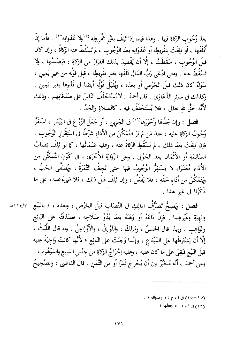 فصل: وإن جَذَّهَا وأحْرَزَها (١٦) في الجَرِينِ، أو جَعَلَ الزَّرْعَ في البَيْدَرِ، اسْتَقَرَّ وُجُوبُ الزكاةِ عليه، عندَ مَن لم يَرَ التَّمَكُّنَ من الأدَاءِ شَرْطًا في اسْتِقْرَارِ الوُجُوبِ. فإن تَلِفَتْ بعدَ ذلك، لم تَسْقُطِ الزَّكاةُ عنه، وعليه ضَمَانُها، كما لو تَلِفَ نِصابُ السَّائِمَةِ أو الأثْمَانِ بعد الحَوْلِ. وعلى الرِّوَايَةِ الأُخْرَى، في كَوْنِ التَّمَكُّنِ من الأدَاءِ مُعْتَبَرًا، لا يَسْتَقِرُّ الوُجُوبُ فيها حتى تَجِفَّ الثَّمَرَةُ، ويُصَفَّى الحَبُّ، ويَتَمَكَّنَ من أدَاءِ حَقِّهِ، فلا يَفْعَلُ، وإن تَلِفَ قبلَ ذلك، فلا شىءَ عليه، على ما ذَكَرْنَا في غيرِ هذا.